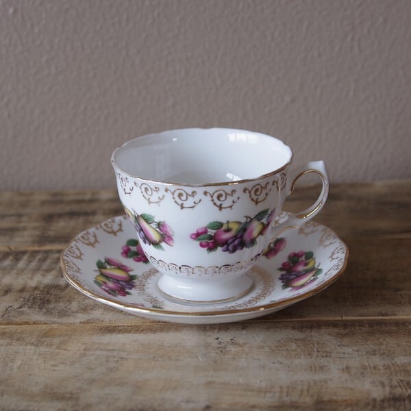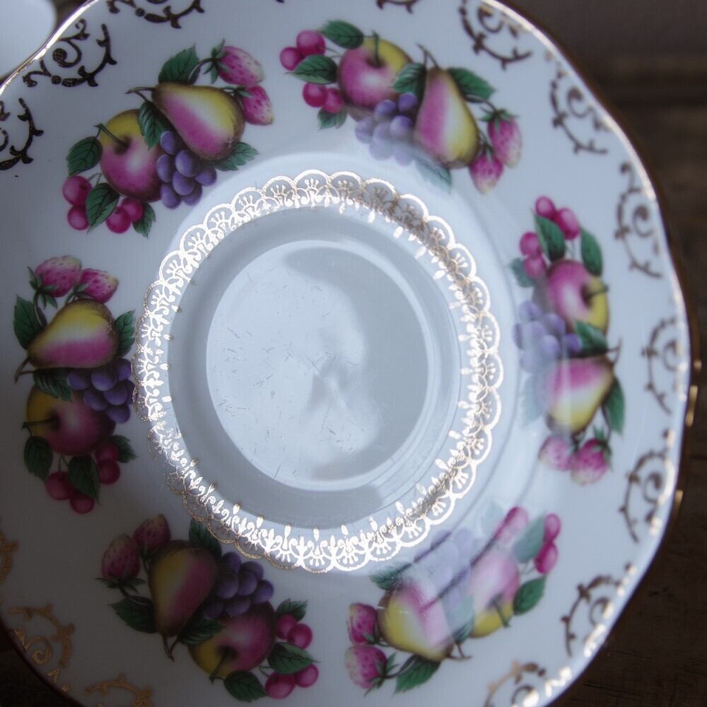 イギリス ヴィンテージ 食器 コルクラフ フルーツ柄 コーヒーカップ ソーサー #200911-3 レトロ Colclough アンティーク 陶器 りんご ブドウ ゴールド