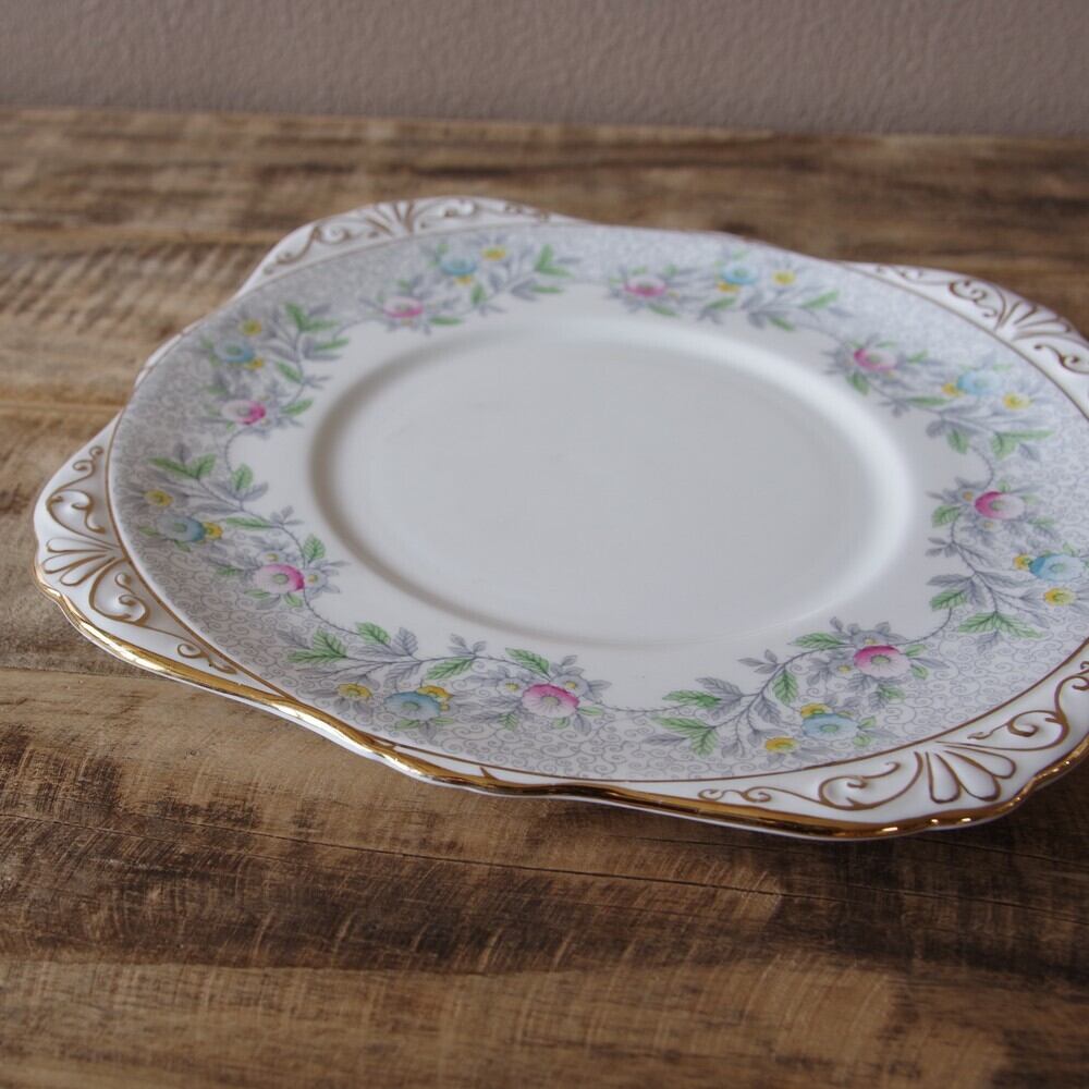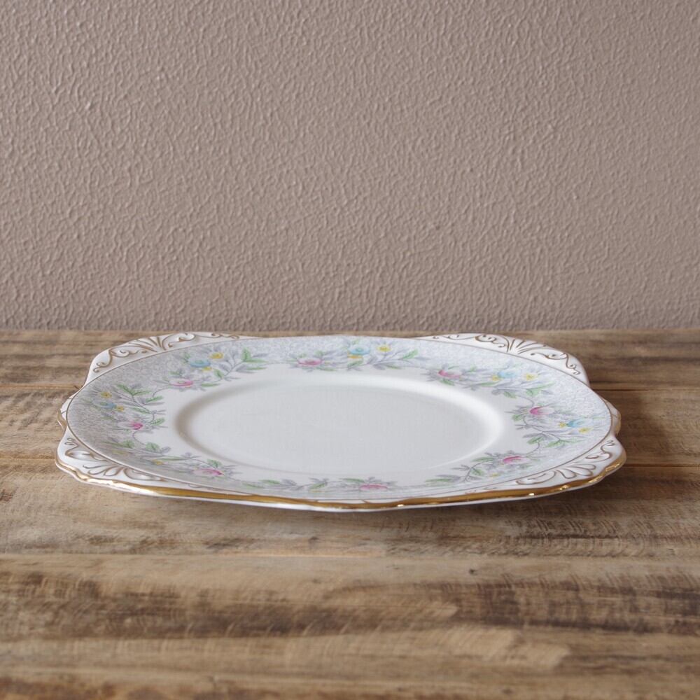 ロイヤルグラフトン グレー パステルカラー レトロ 花柄 持ち手付き スクエアプレート サンドイッチプレート 23cm アールデコ #200930 イギリス アンティーク ヴィンテージ 食器 Royal Grafton