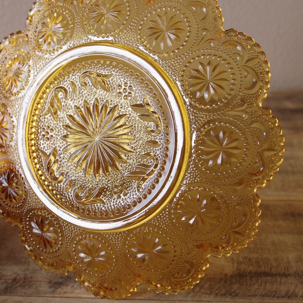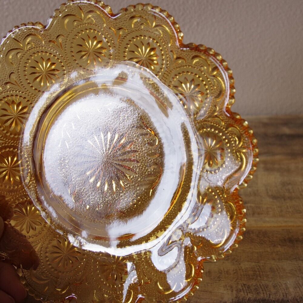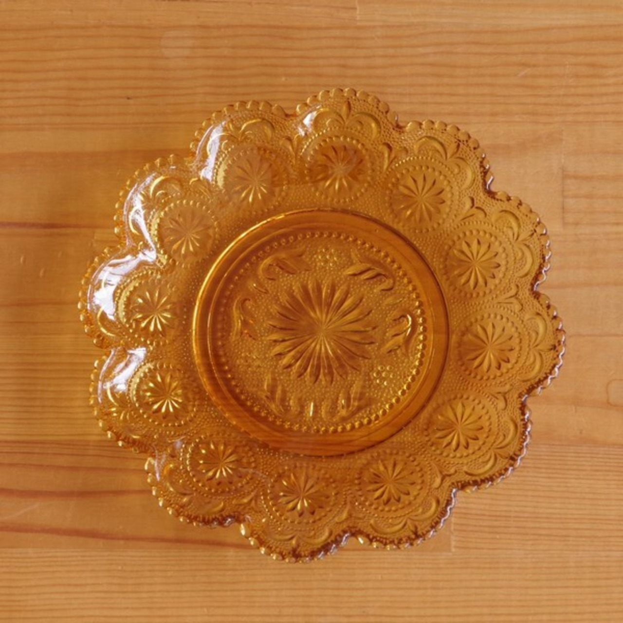 琥珀色のガラス製で、花のような模様のレリーフが入った