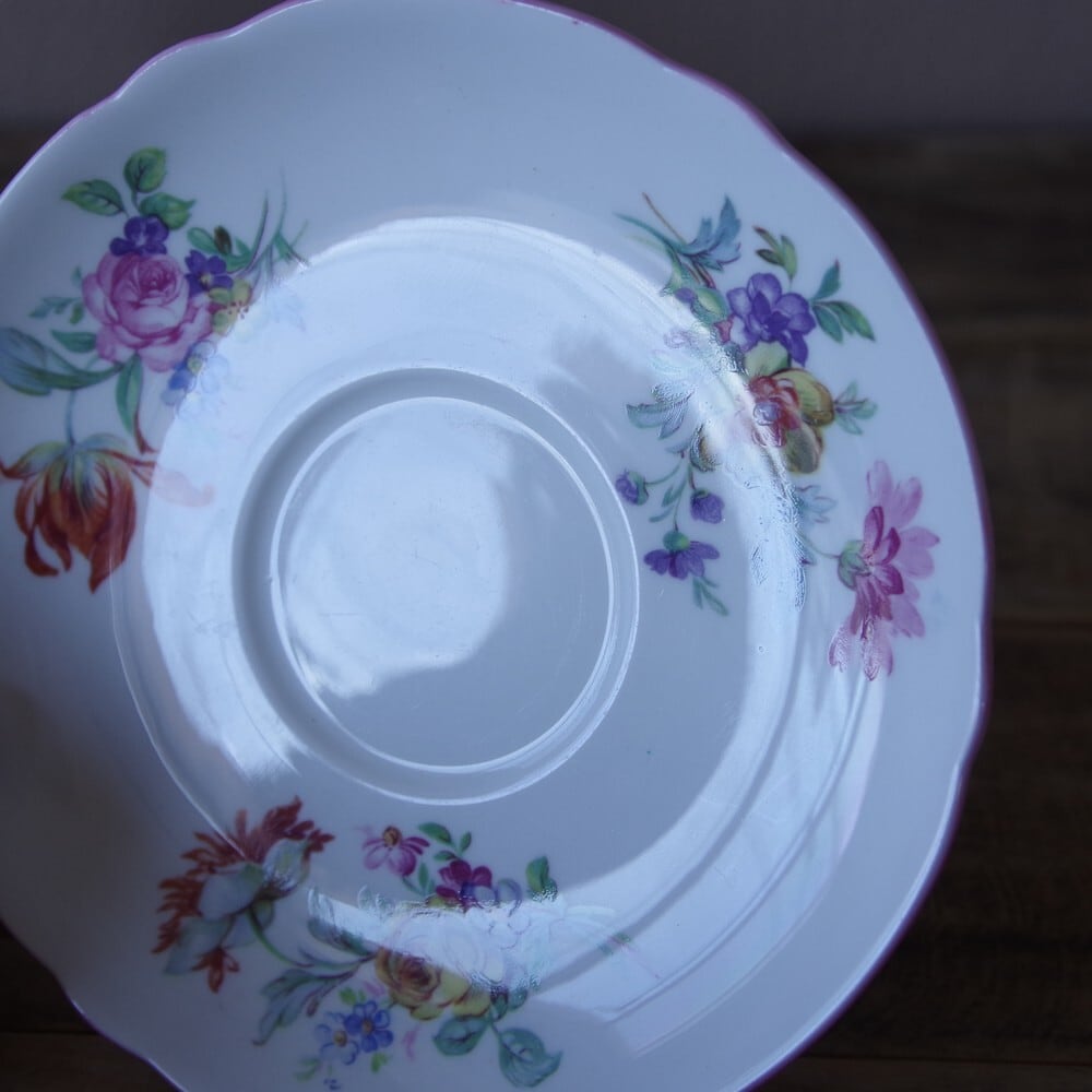 非常に薄い陶磁器製で、カラフルな花の絵柄が華やかに描かれています。