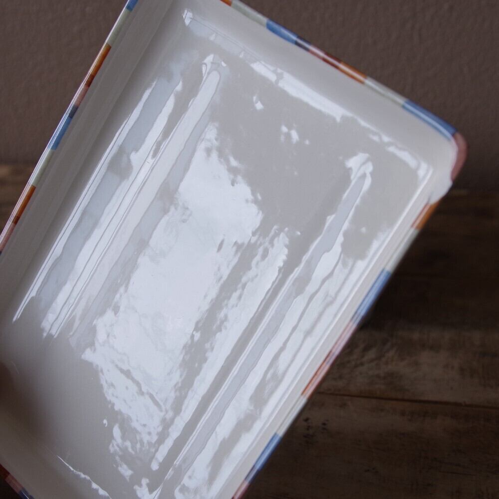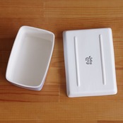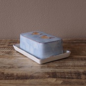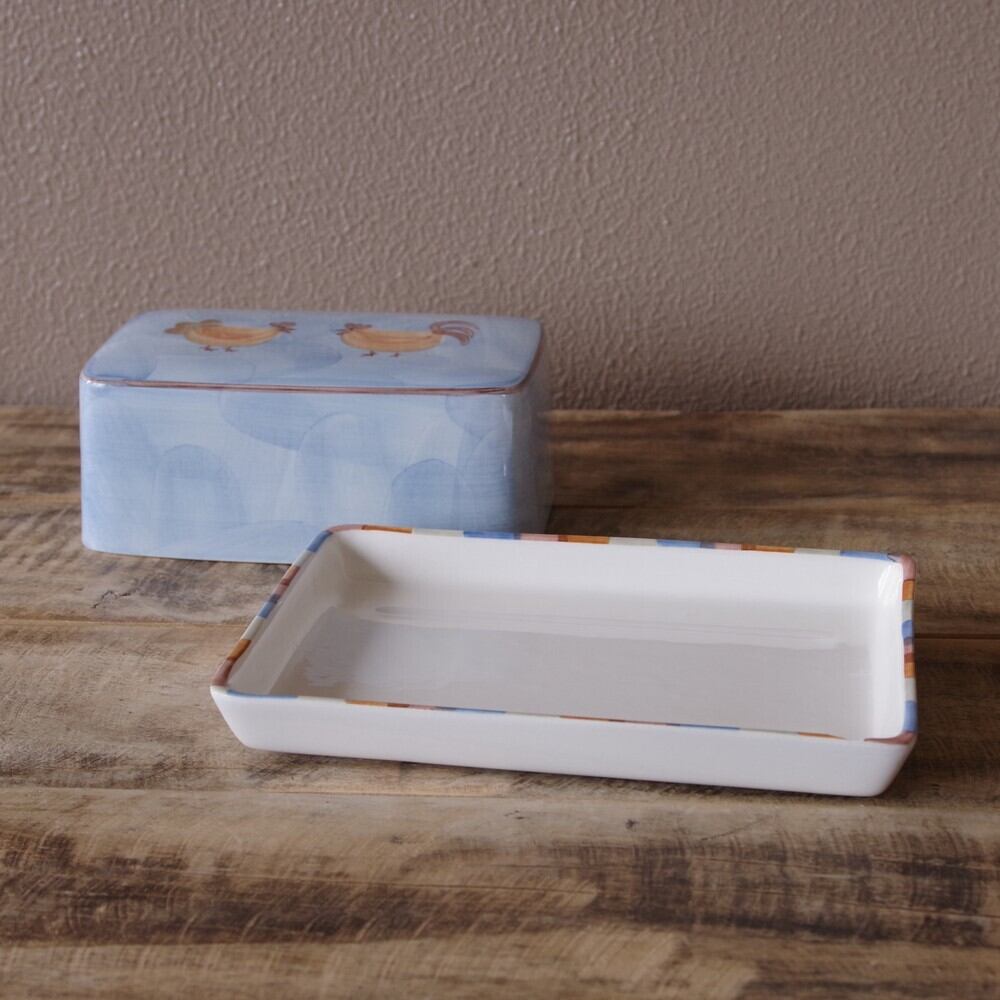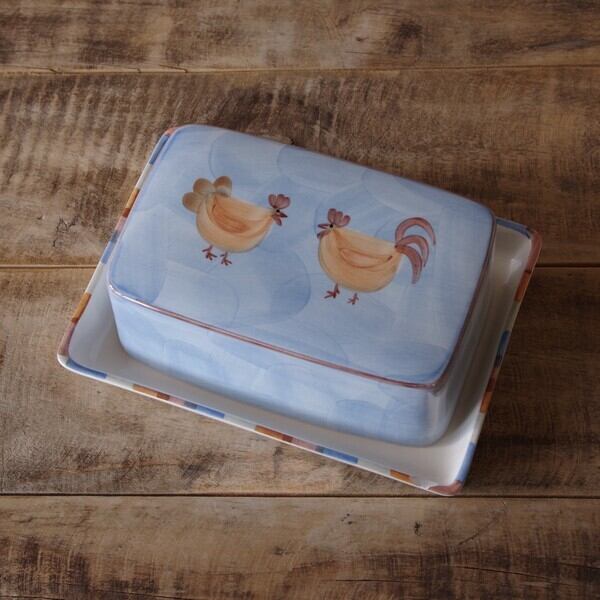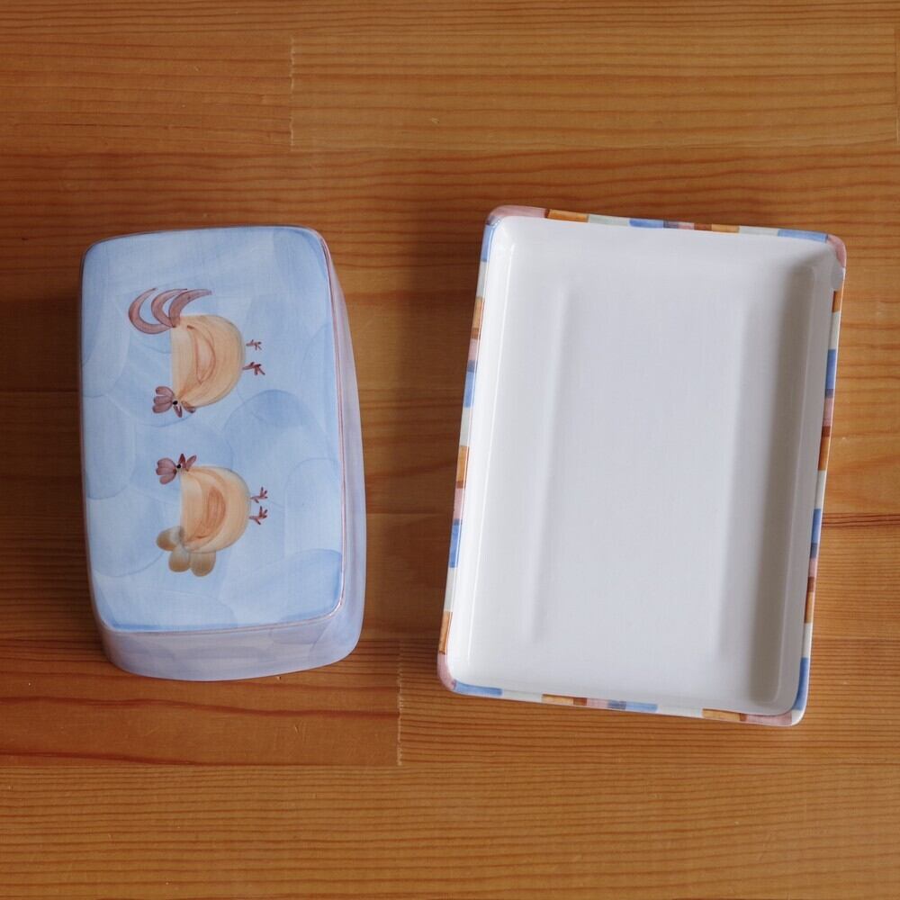 手描きされた絵柄や色がかわいらしいバターケースです。