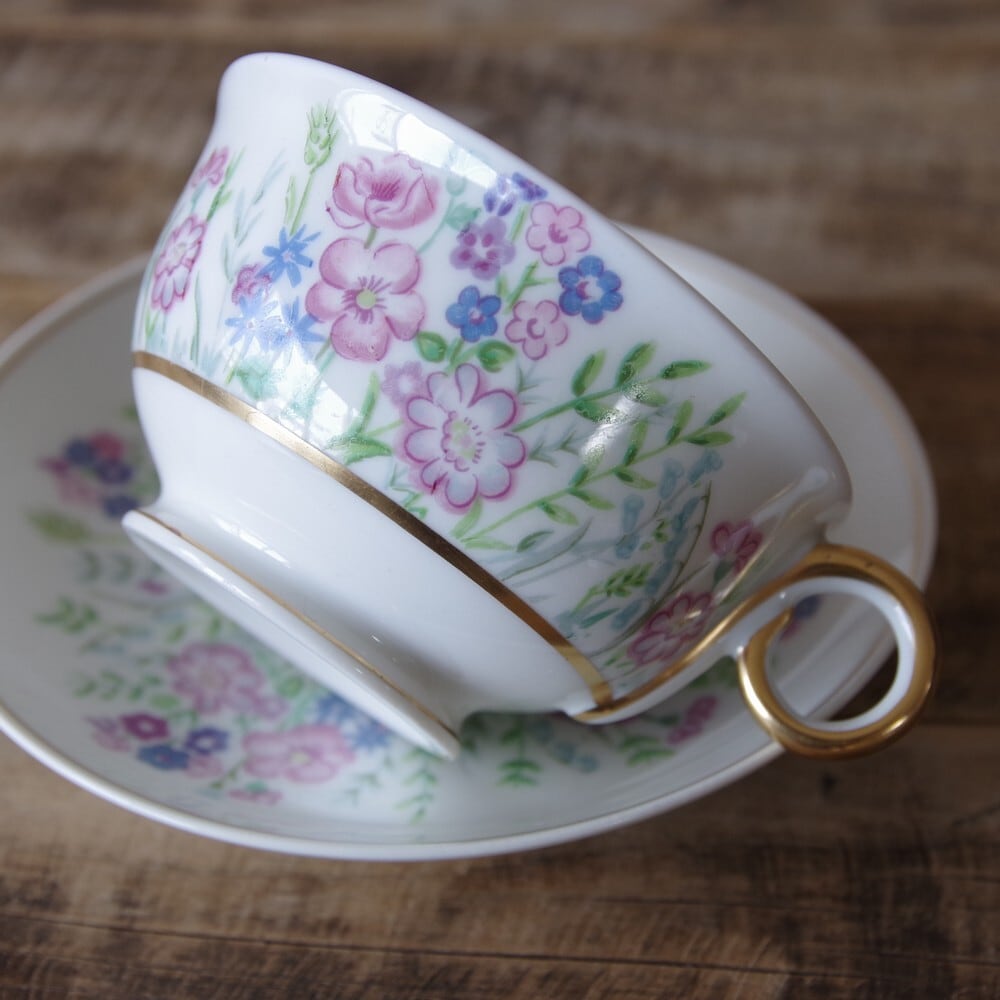 花畑のように、カラフルな花の絵柄が描かれたかわいいカップです。