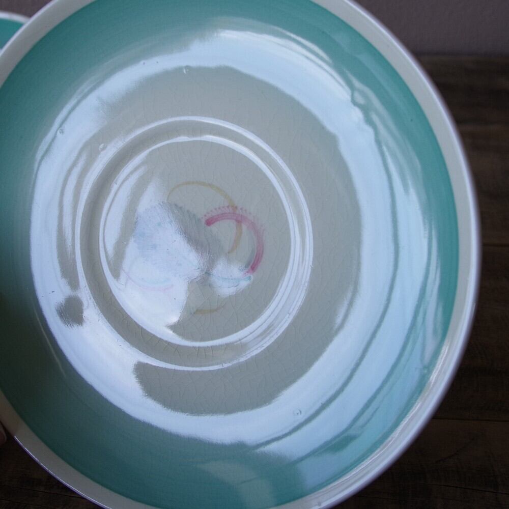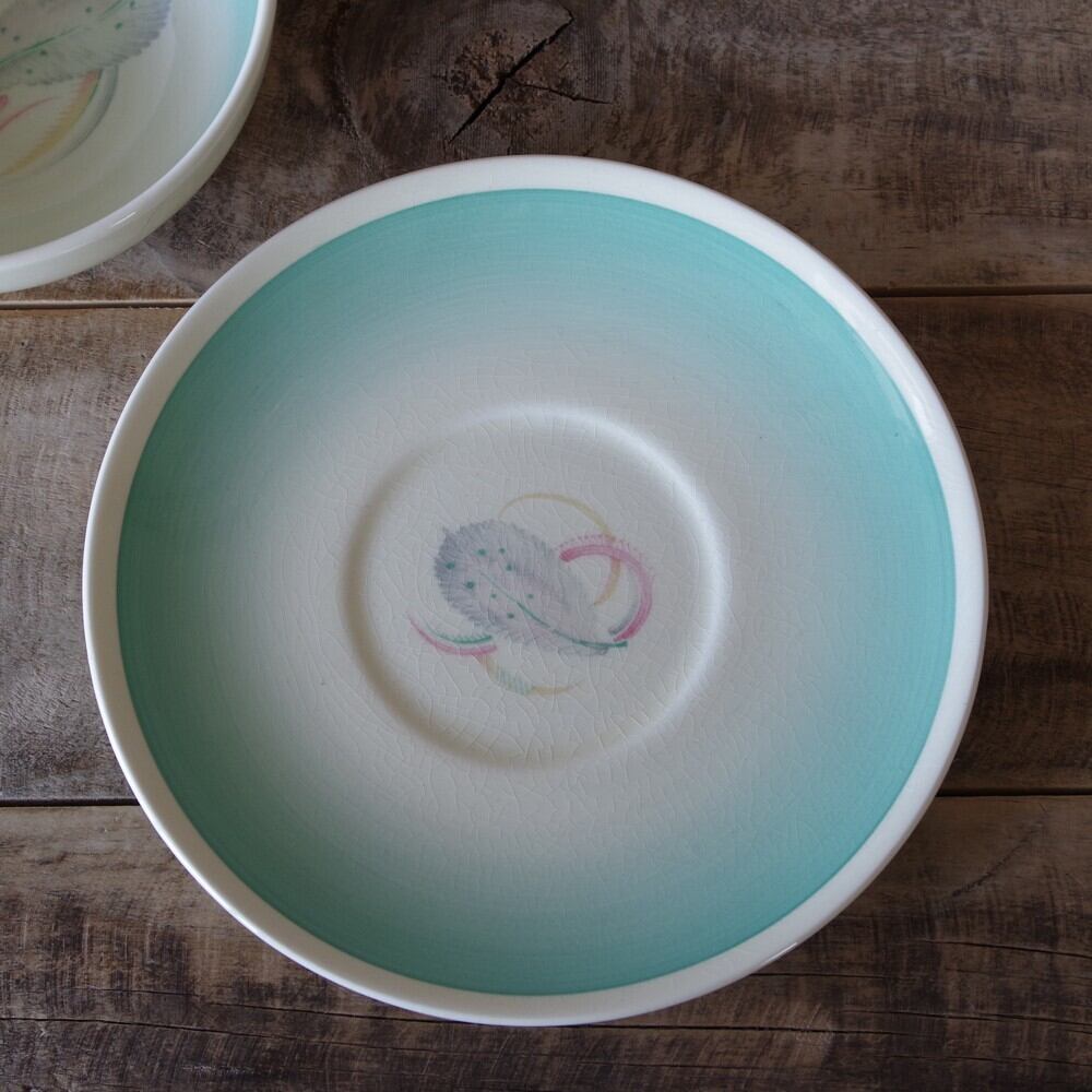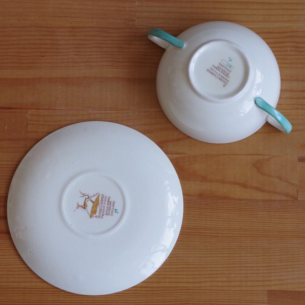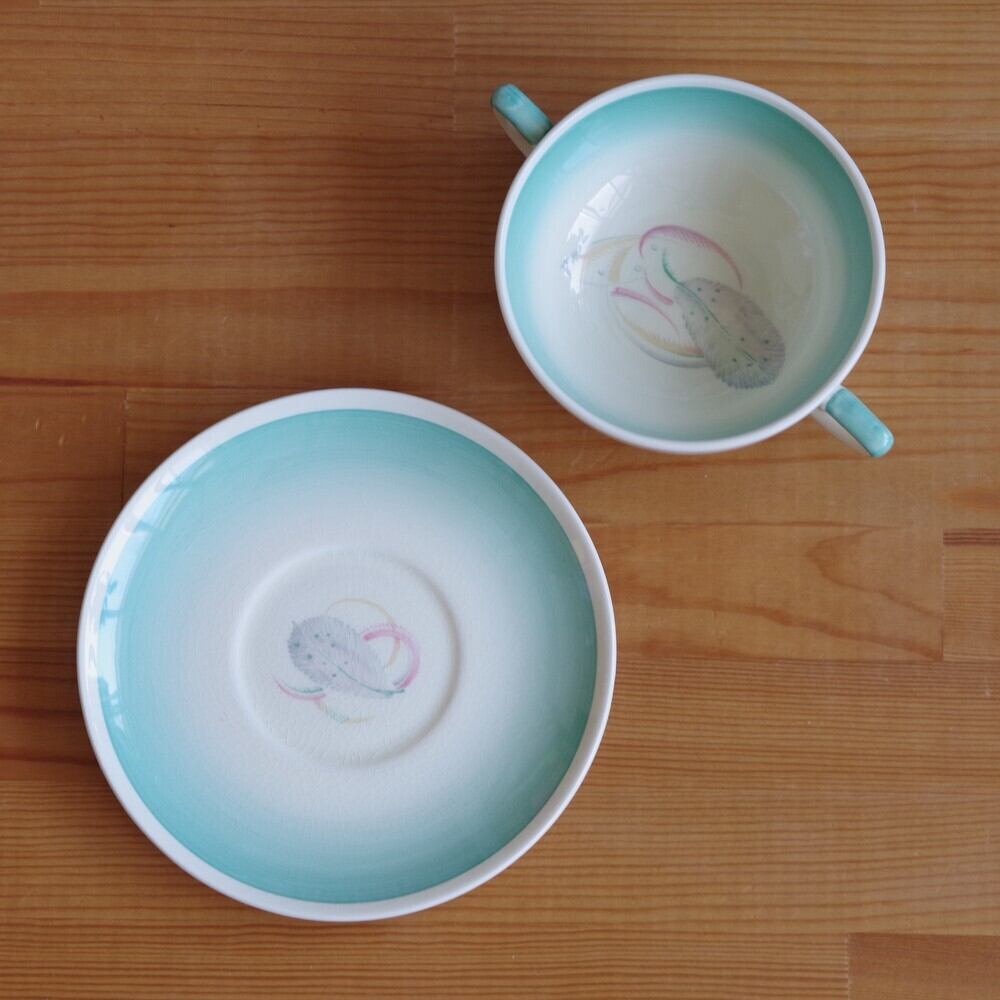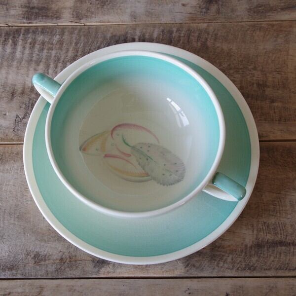 アンティーク 食器 スージークーパー 羽根 模様 グリーン スープカップ ボウル ソーサー Feather #210227-5 イギリス ヴィンテージ Susie Cooper 陶器 パステルカラー