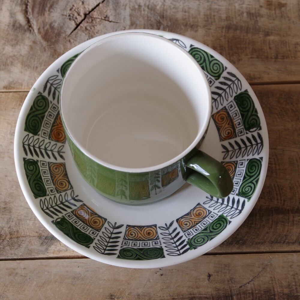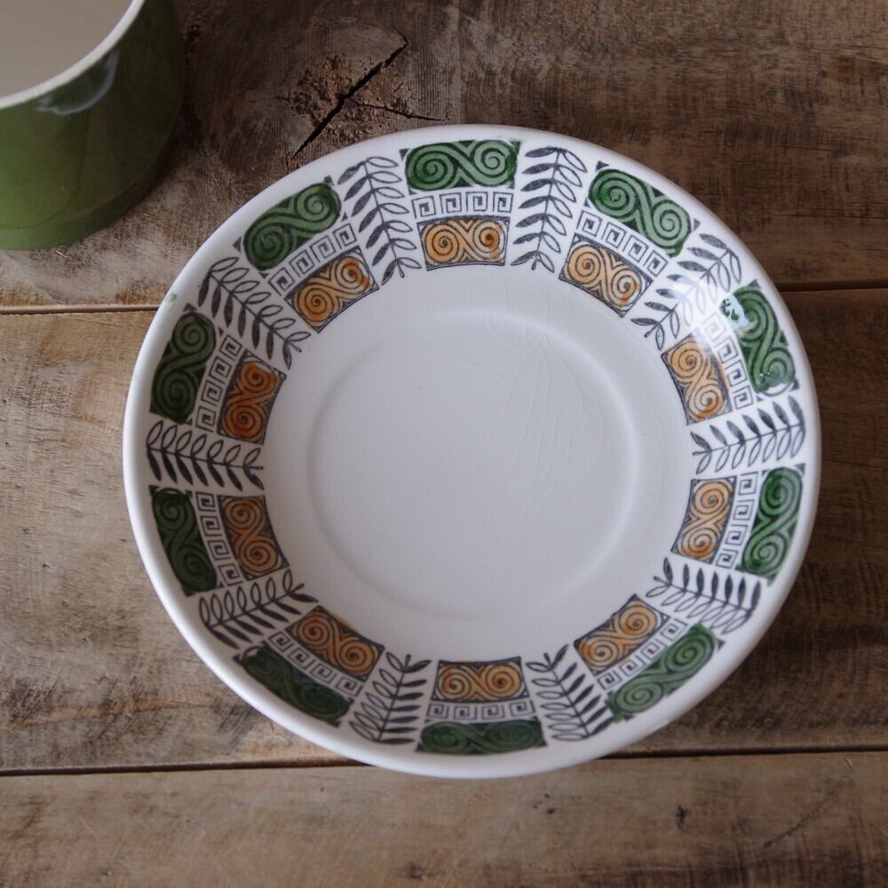 ソーサーのリム部分には、グリーンとオレンジで、渦巻きのような絵柄が入っており、