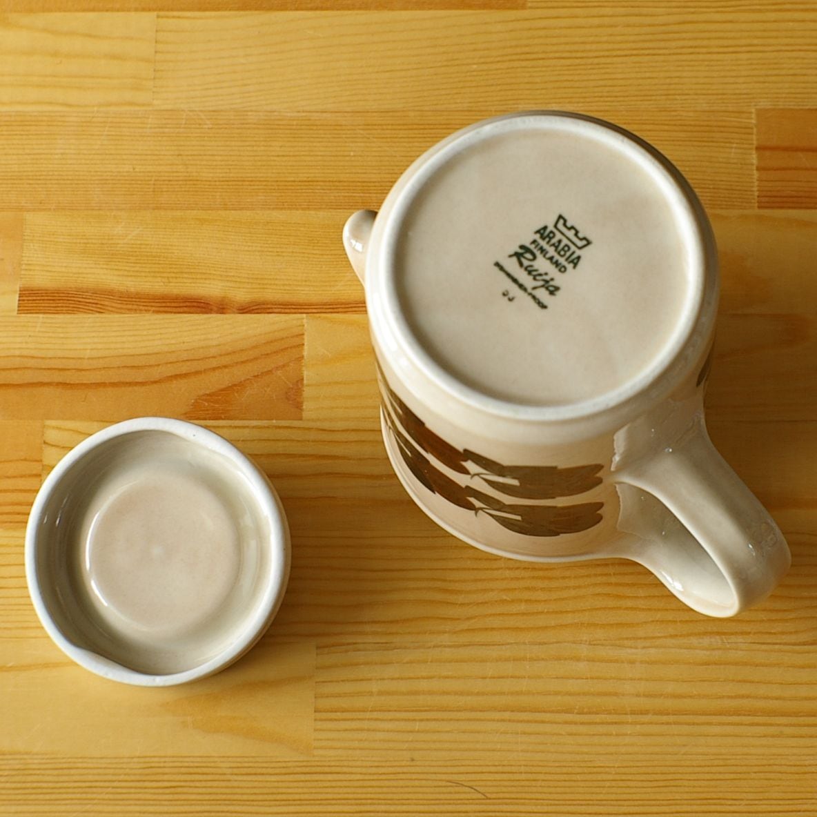 アラビアの食器には、高台部分(裏側の白い部分)に凹みや小さなカケ、裏面に削れ、釉薬の色むら、小さなひっかき傷があるものが比較的多いです。