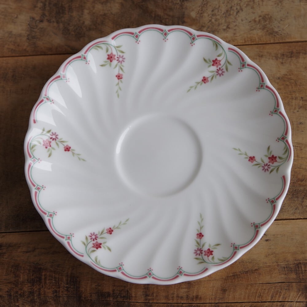ふちの部分に、ピンク色の小さな花が描かれたかわいらしいデザインです。