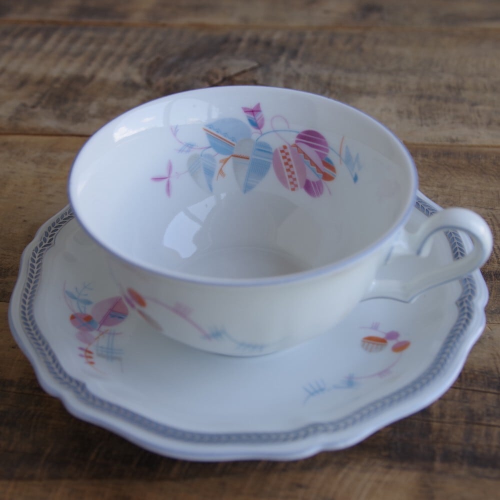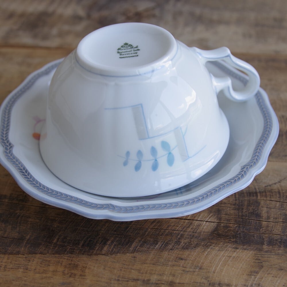 淡いブルーのふちどりがあり、ソーサーのリム部分には、シルバーで縄目のような模様が入っています。