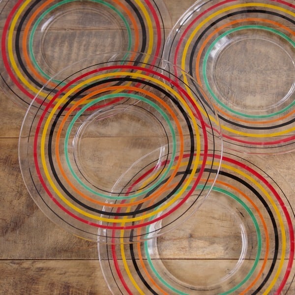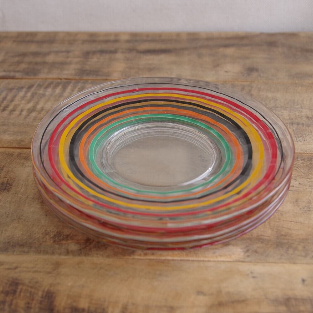 4枚セット アンティーク食器 アンカーホッキング ガラス プレート カラフル サークル模様 16cm #210815-2 イギリス製 ヴィンテージ Anchor Hocking