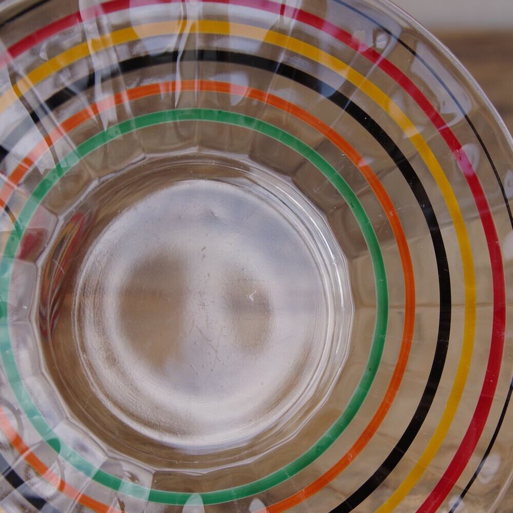 透明のガラス製で、赤や黄色、グリーン、黒などで、同心円状にラインが入っています。