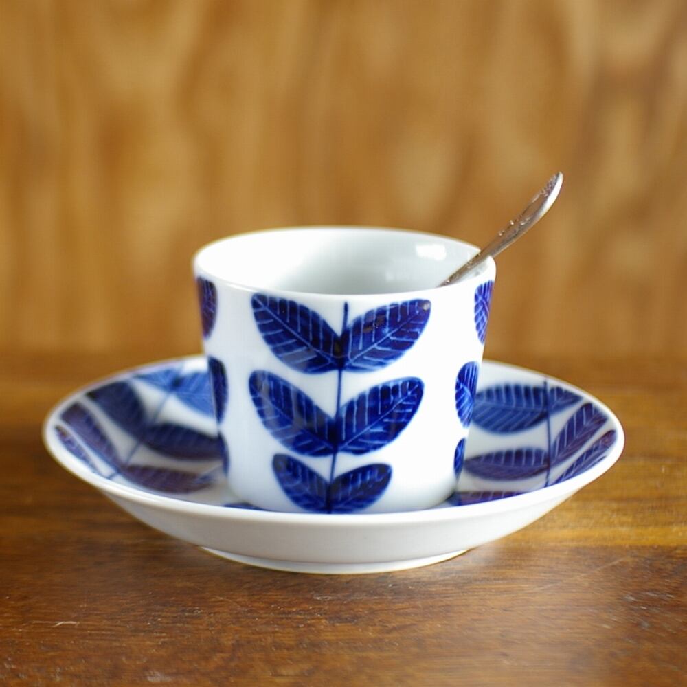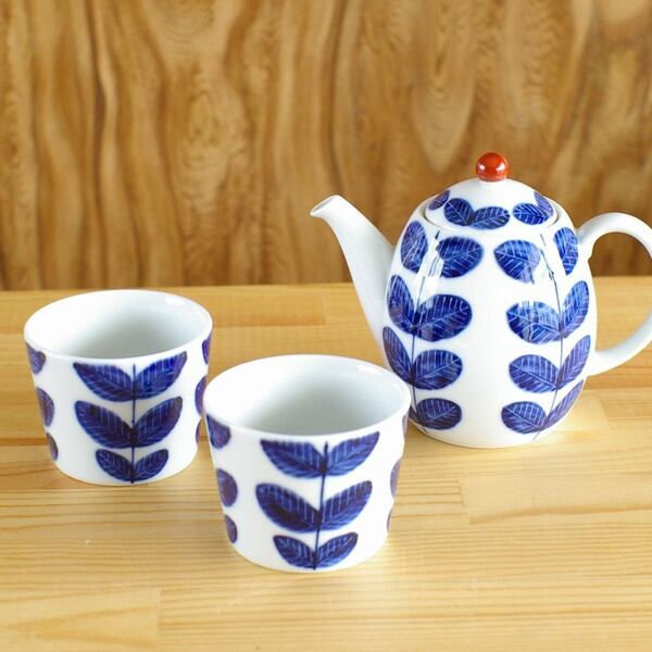 濃淡のあるコバルトブルーで描かれた北欧風の葉っぱ柄が、ツヤツヤとしてとても素敵な風合いです。