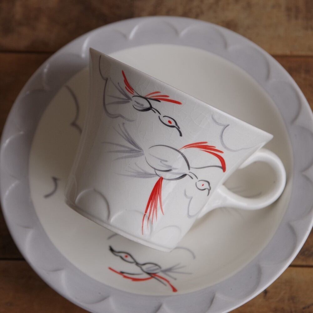 バラッツ Barratt’s Staffordshire 鶴 手描き 鳥 コーヒーカップ ソーサー レトロ アンティーク食器 #211104-2 イギリス バラット つる ヴィンテージ 陶器
