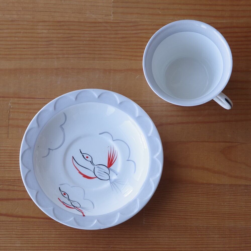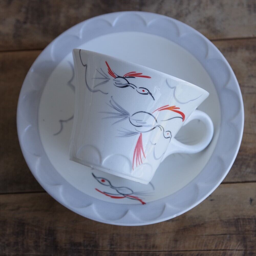 バラッツ Barratt’s Staffordshire 鶴 手描き 鳥 コーヒーカップ ソーサー レトロ アンティーク食器 #211113-3 イギリス バラット つる ヴィンテージ 陶器