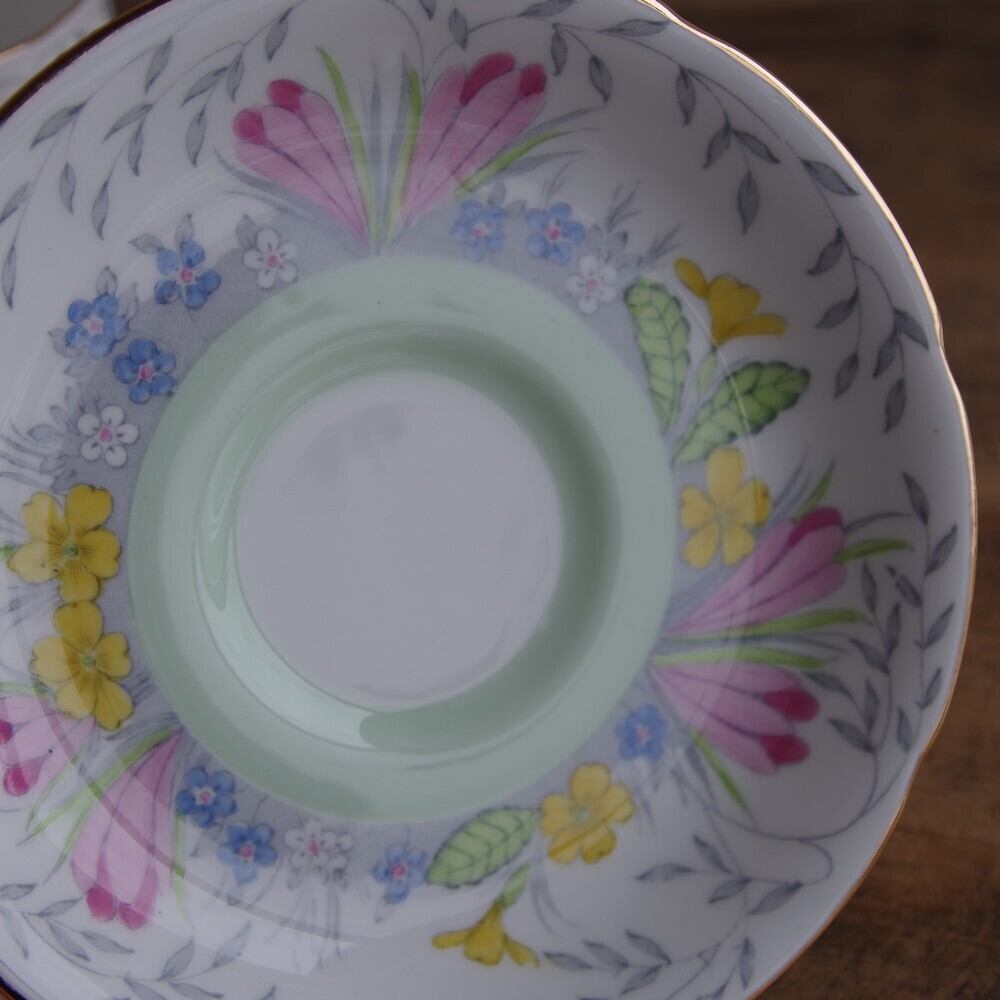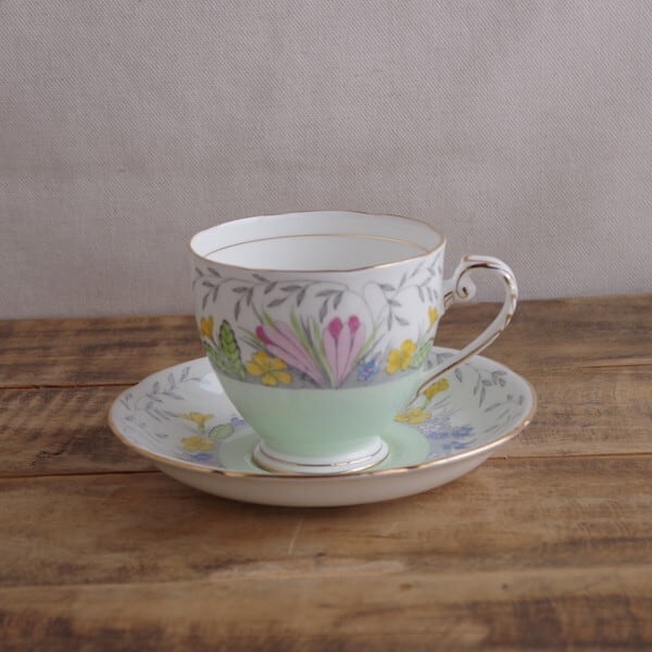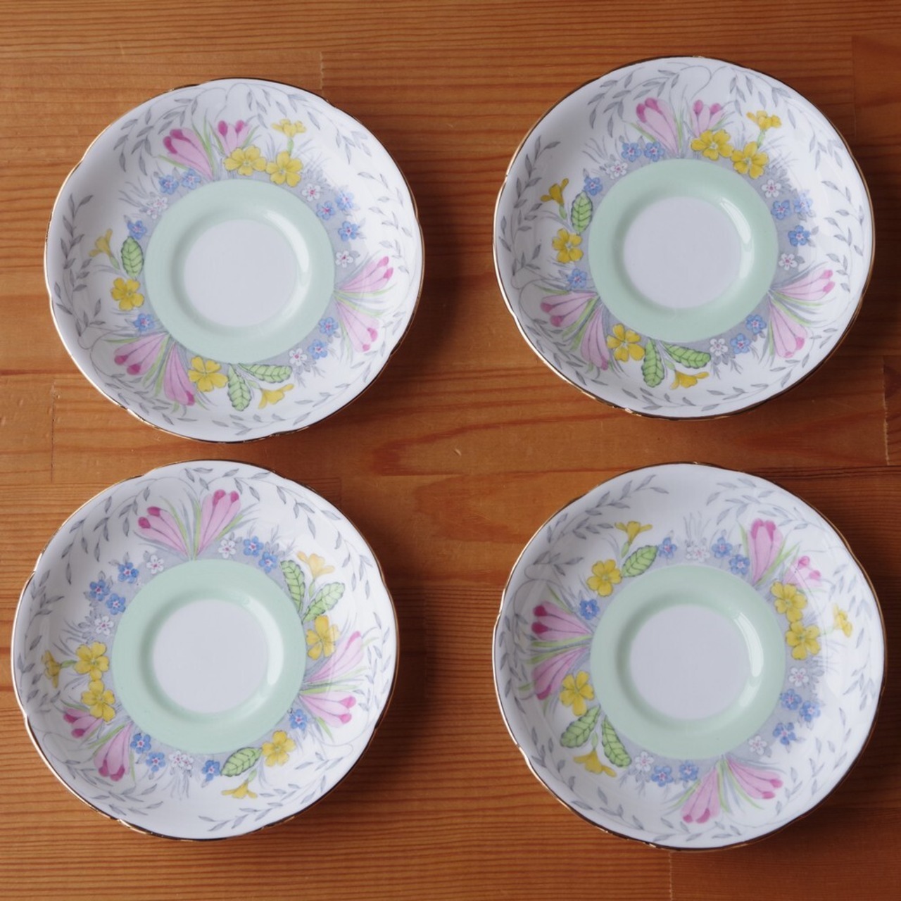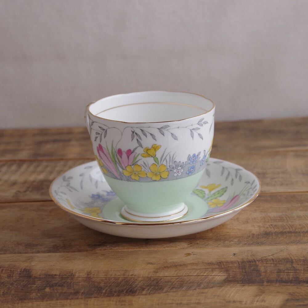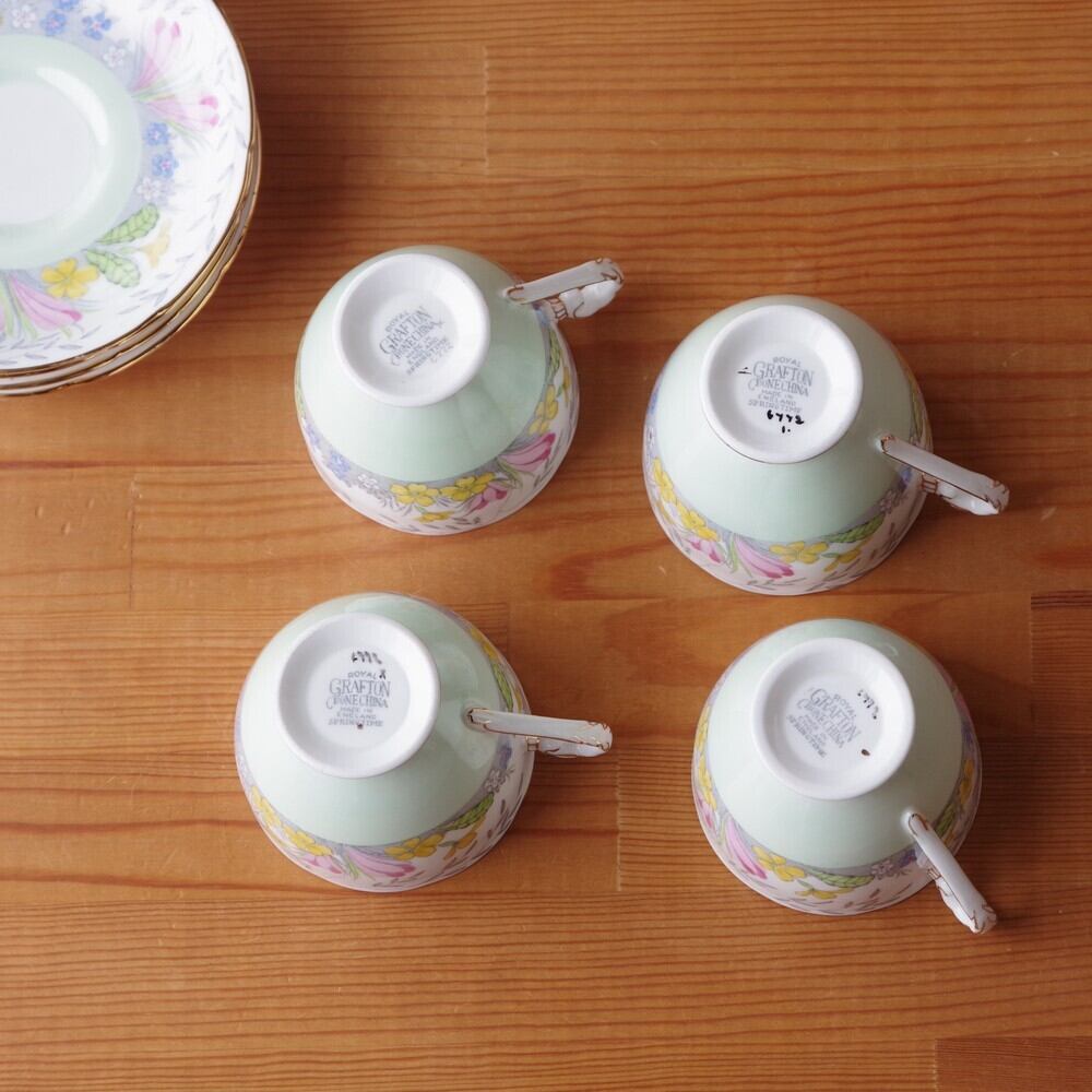 ロイヤルグラフトン スプリングタイム クロッカス キンポウゲ 花柄 グリーン コーヒーカップ ソーサー #220219-1~4 イギリス Royal Grafton Springtime レトロ アンティーク 食器