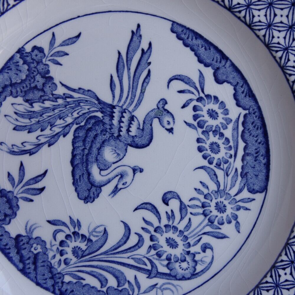 鳥や花の絵柄がコバルトブルーの染付で描かれた