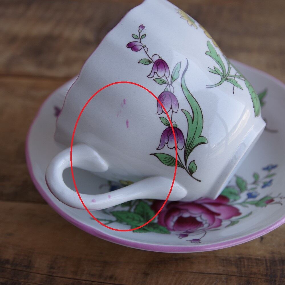 こちらのカップには、側面や持ち手にピンク色の色汚れがある箇所があります。