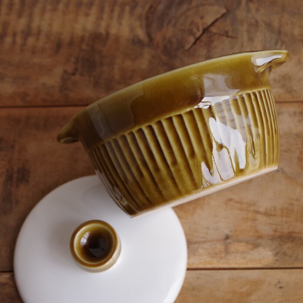 両脇に小さな持ち手のついた蓋つきのボウルです。