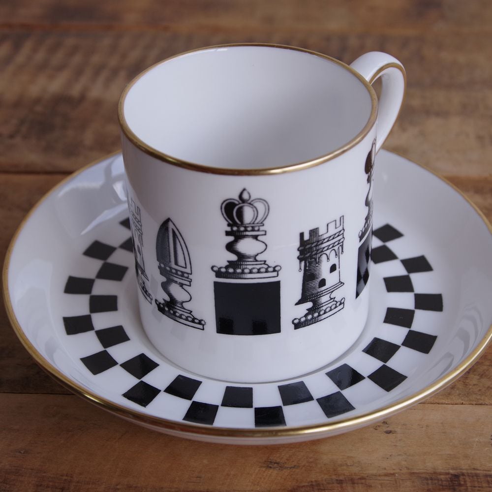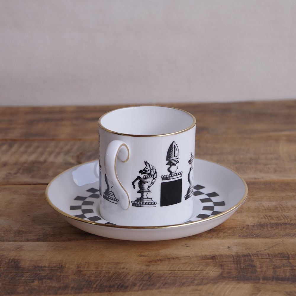 ソーサーにはチェス盤を模して白黒の市松模様が入り、