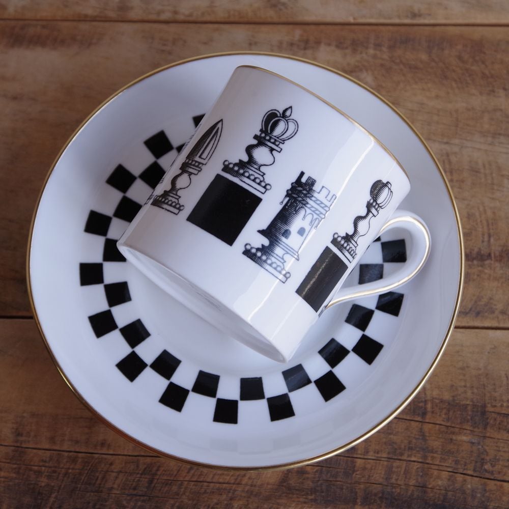 ソーサーにはチェス盤を模して白黒の市松模様が入り、