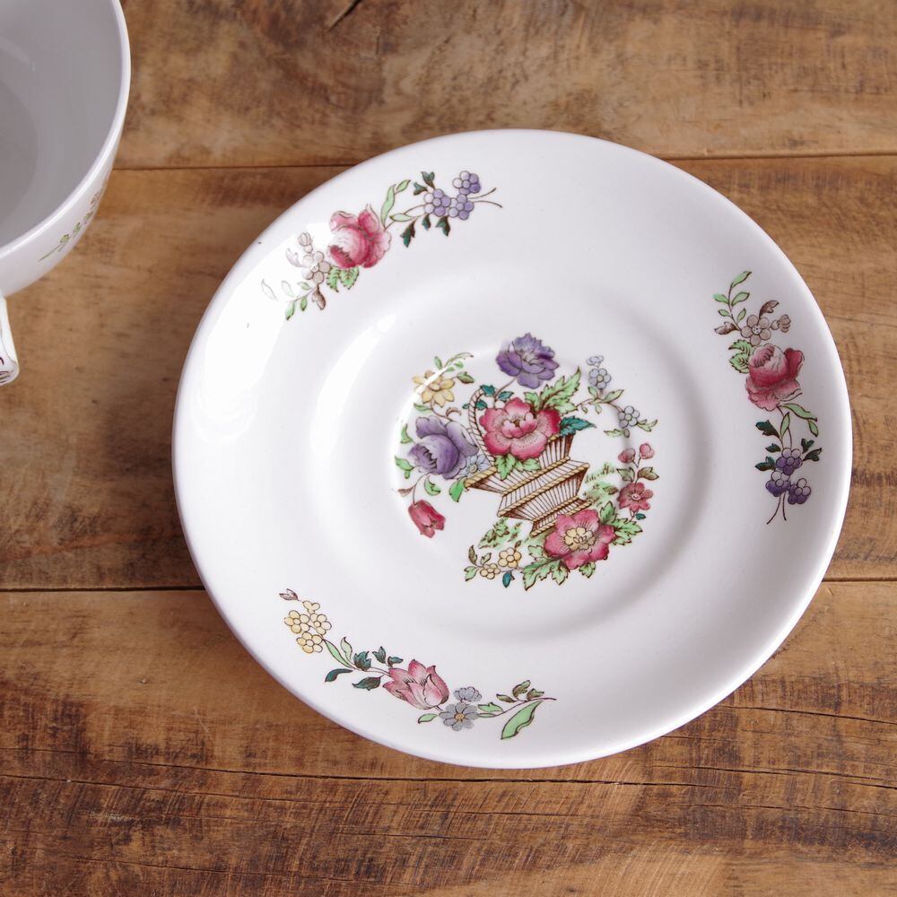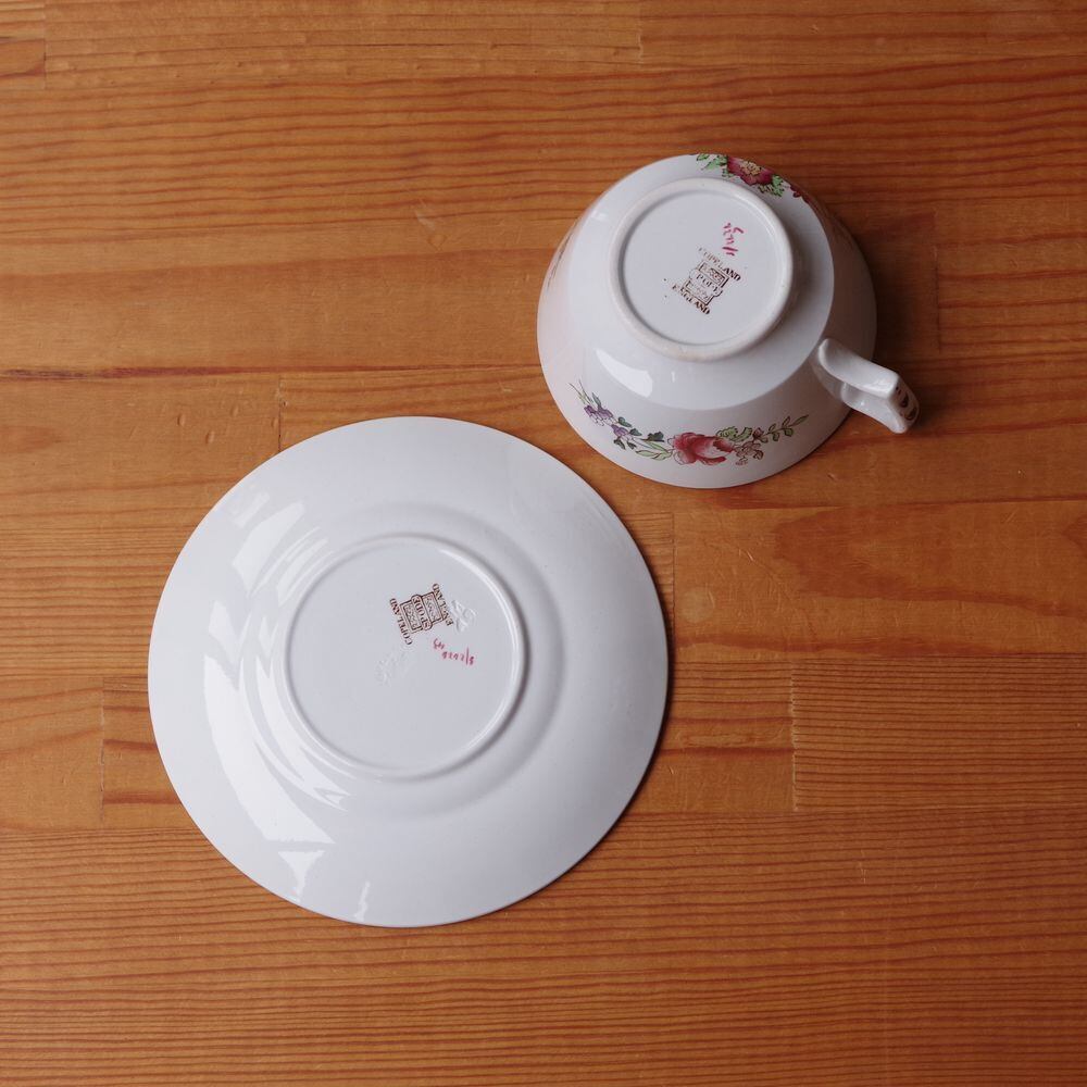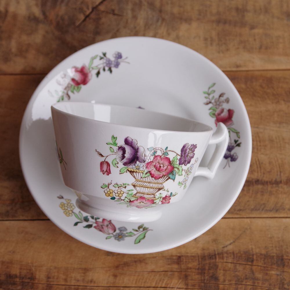 スポード 薔薇 バスケット 花柄 ティーカップ ソーサー ピンク 紫 レトロ Spode #230221-2 イギリス アンティーク ヴィンテージ 食器 陶器
