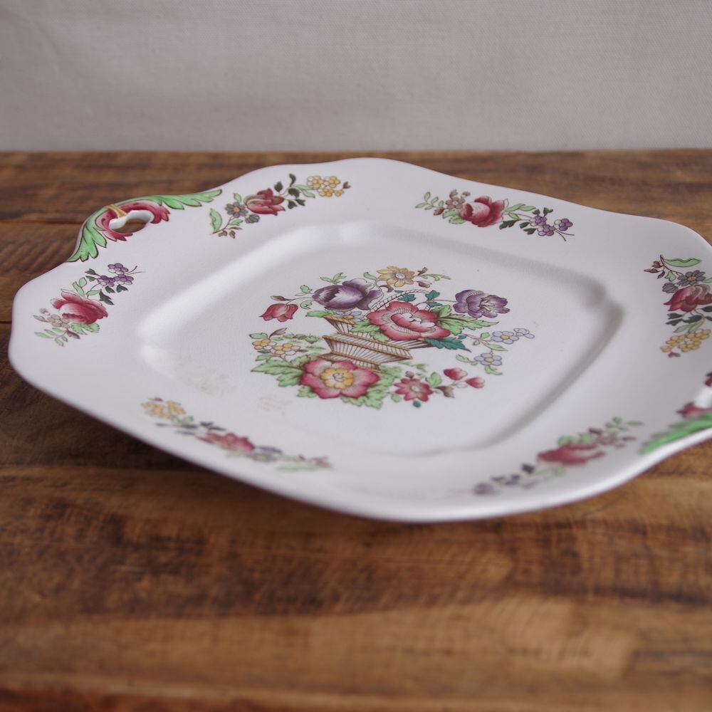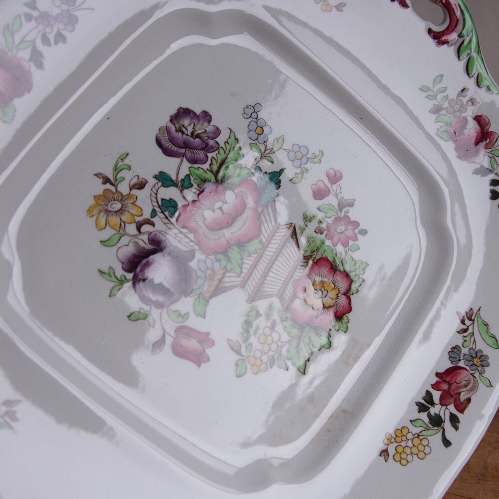 スポード 薔薇 バスケット 花柄 持ち手付き プレート 盛り皿 28cm 大皿 ピンク 紫 レトロ Spode #230221 イギリス アンティーク ヴィンテージ 食器 陶器