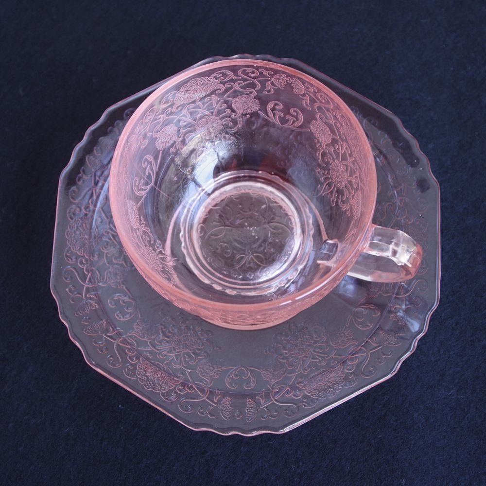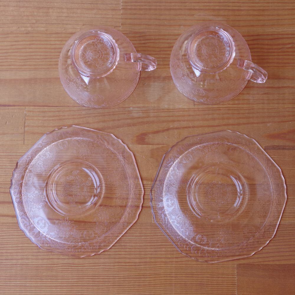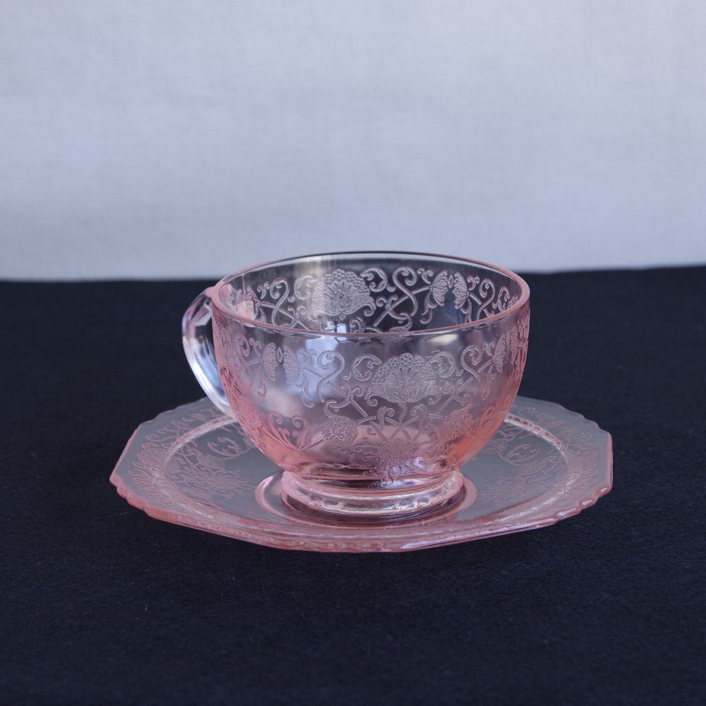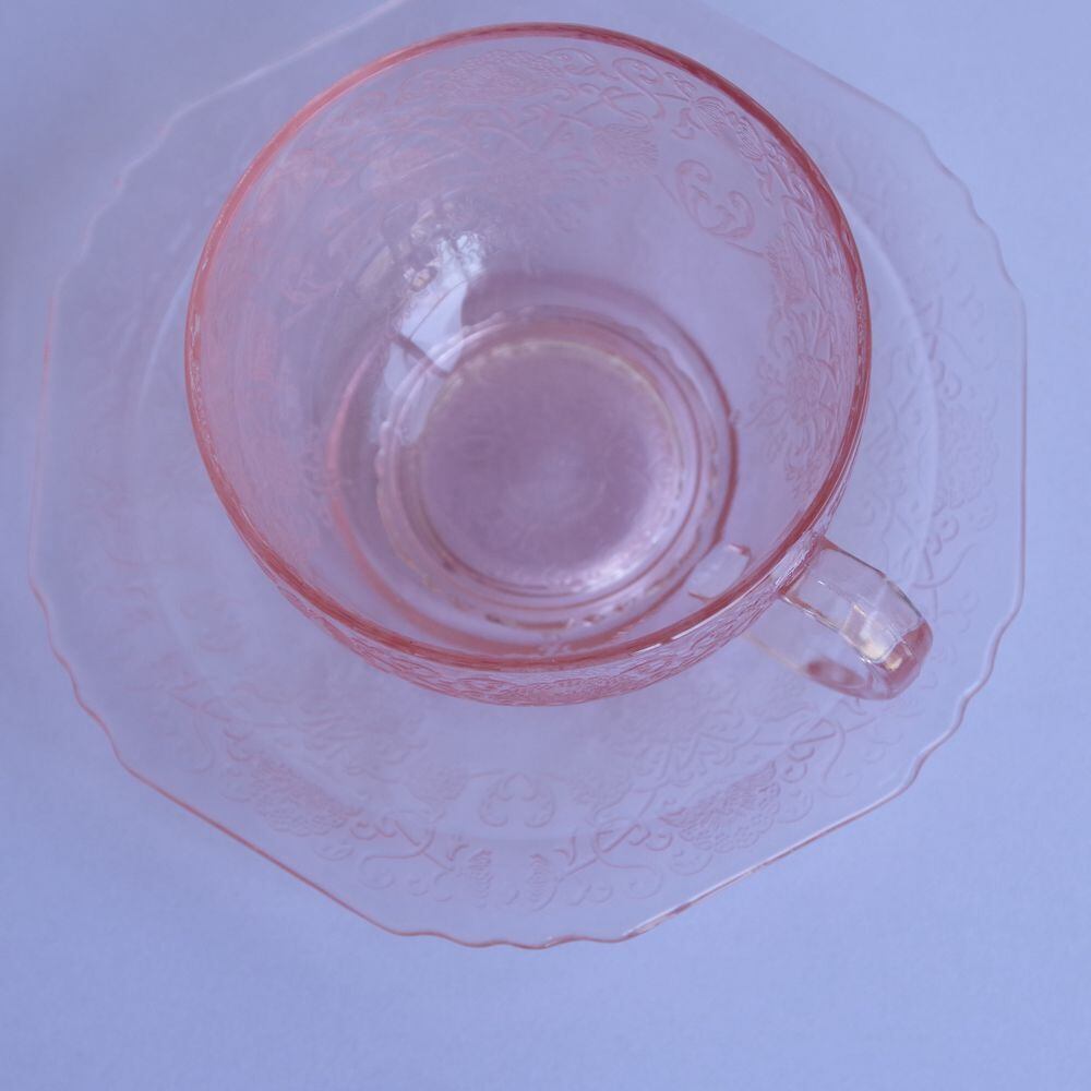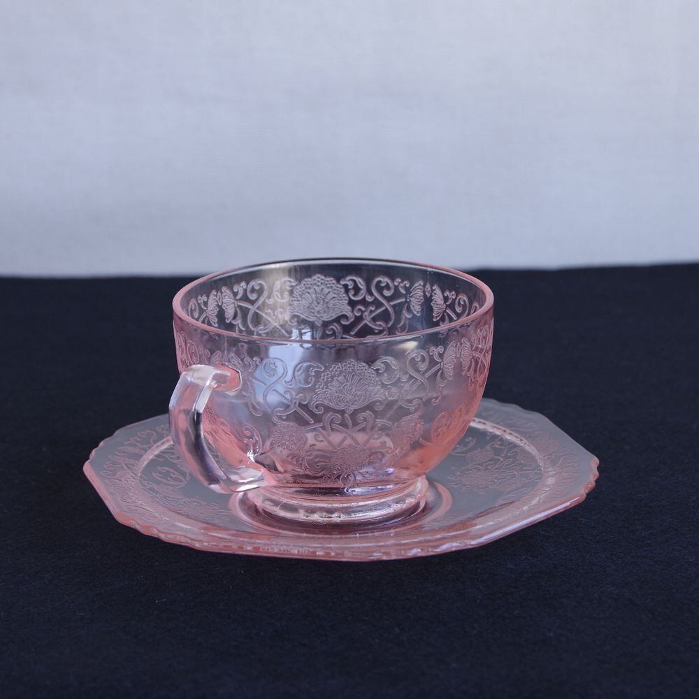 ヘーゼルアトラス フロレンティーン ピンク ガラス コーヒーカップ ソーサー Hazel Atlas Florentine #230222-1,2 アメリカ製 ヴィンテージ 食器 レトロ 雑貨