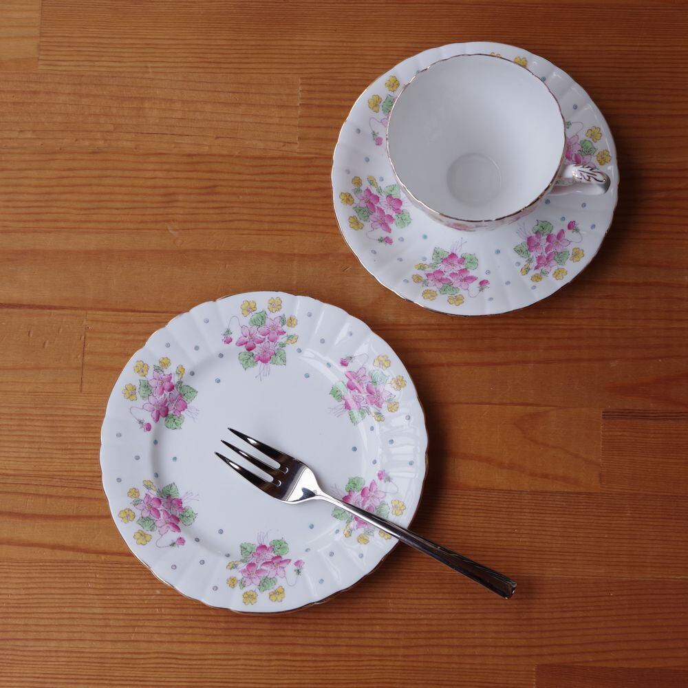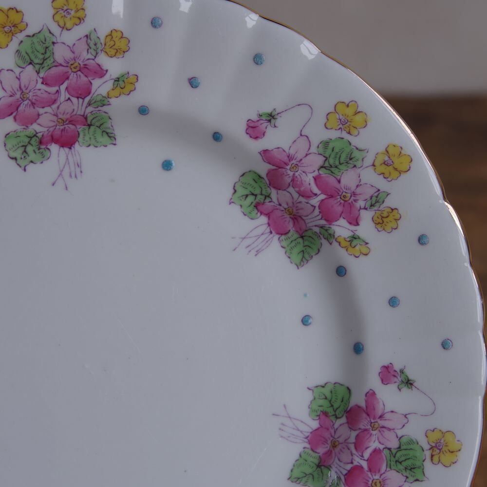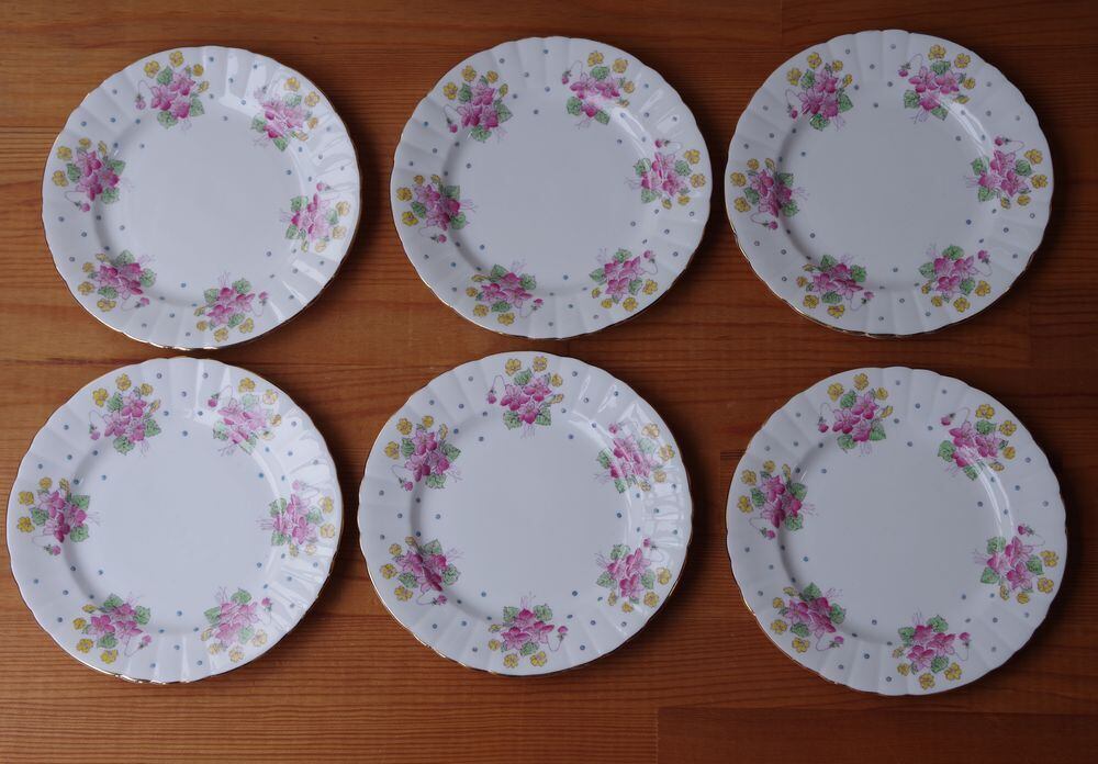 ロイヤルグラフトン エステール すみれ キンポウゲ 花柄 水玉 デザートプレート ケーキ皿 16cm Royal Grafton Estelle ヴィンテージ #230309-1~6 イギリス アンティーク 陶器 食器 ドット柄 レトロ