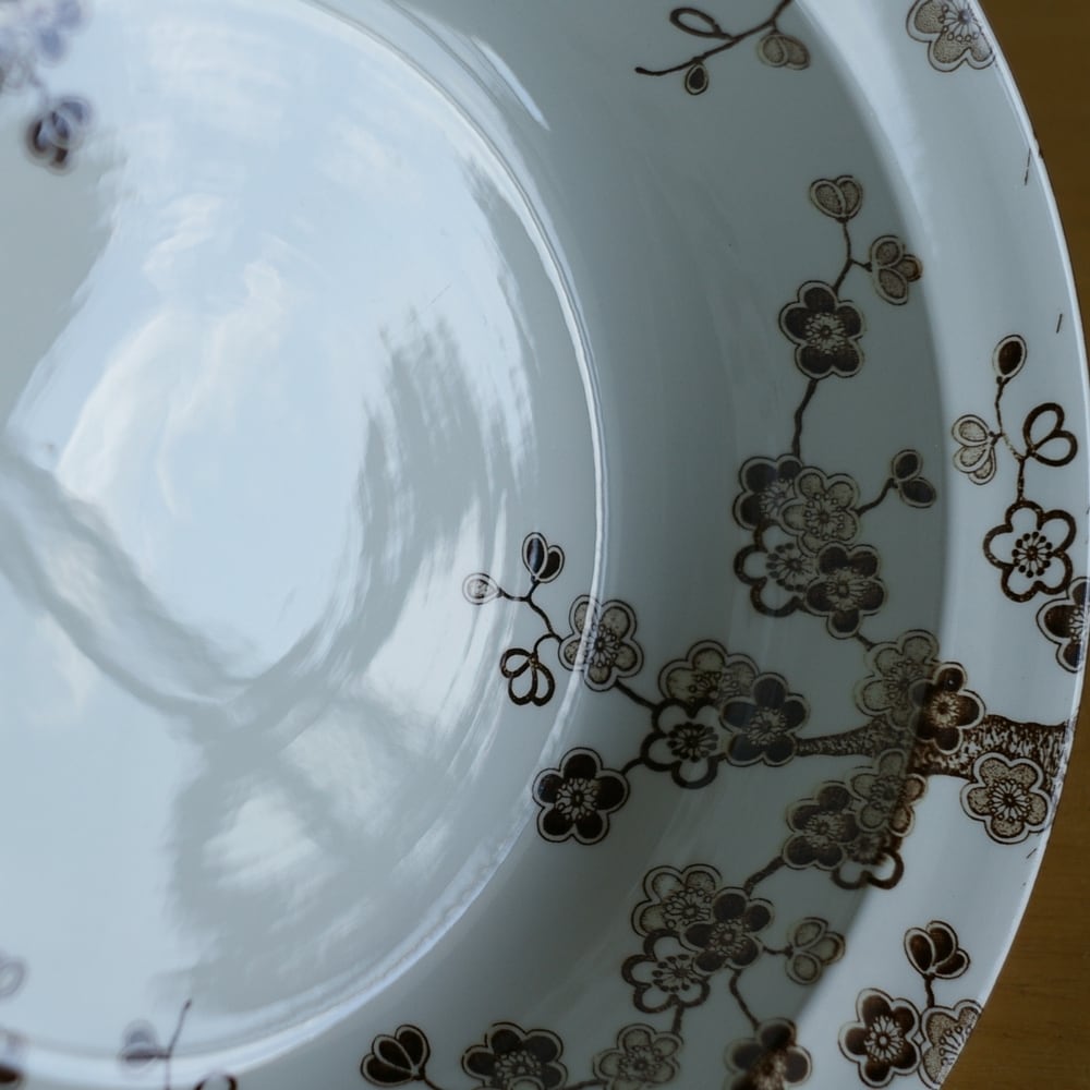 版画のようなかすれたタッチのブラウンのラインで、梅の枝の絵柄が入っています。
