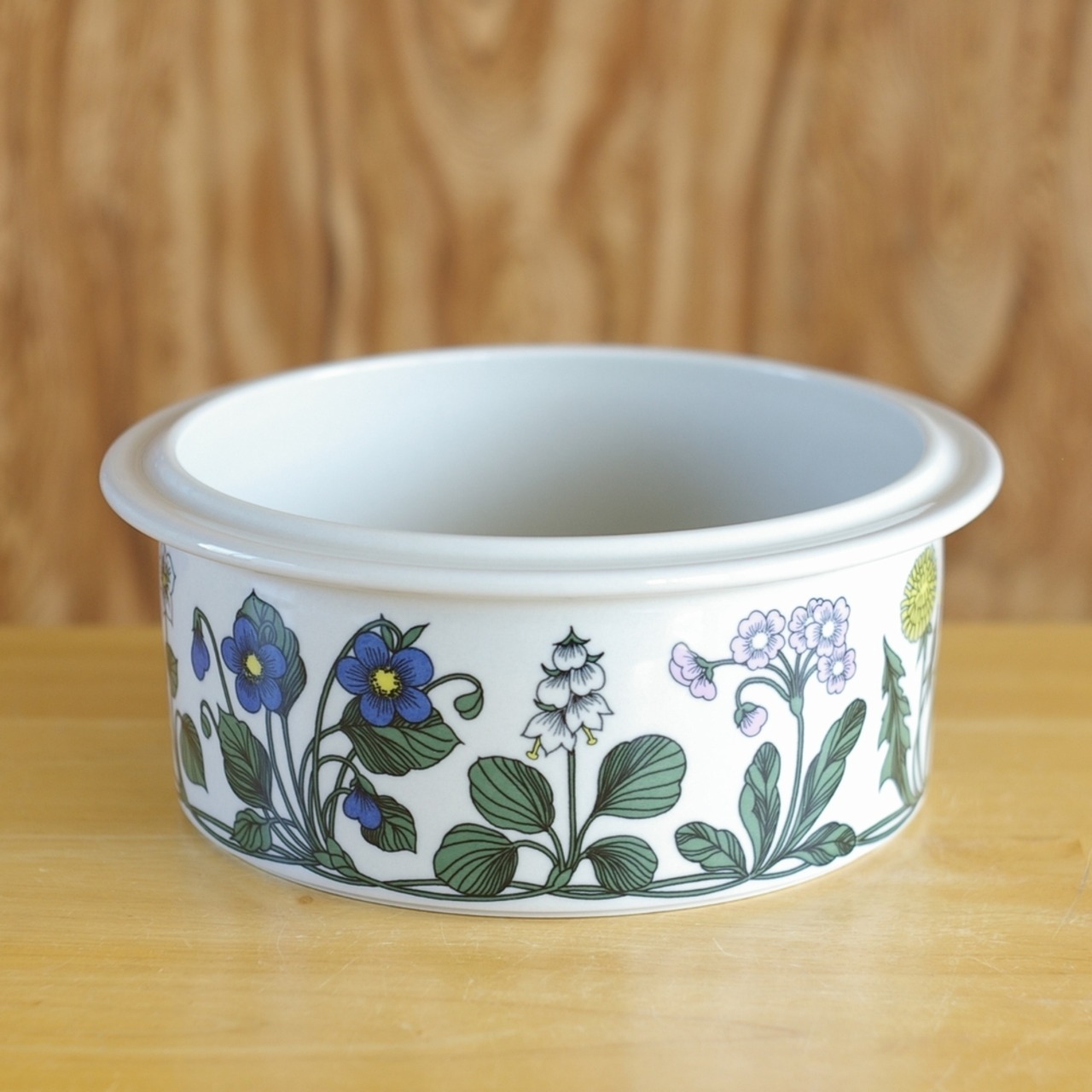 薄いグレーの地で、側面にはたんぽぽや水仙、すずらんなどの野の花が描かれています。