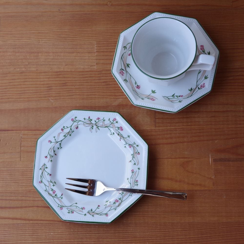 ジョンソンブラザーズ エターナルボウ デザートプレート ケーキ皿 中皿 16cm リボン 花柄 Johnson Brothers #231123-1,2 イギリス製 ヴィンテージ 食器 陶器 八角形