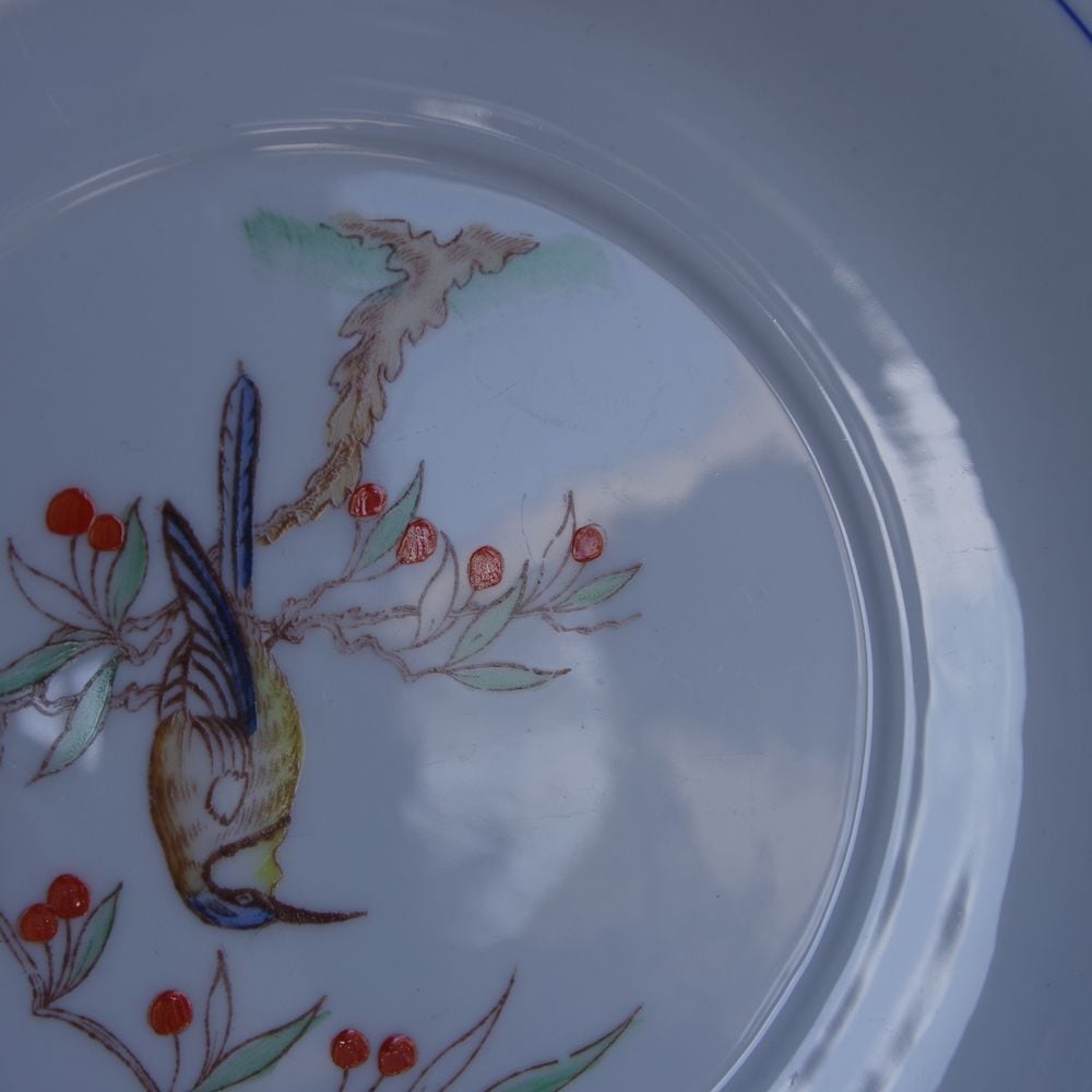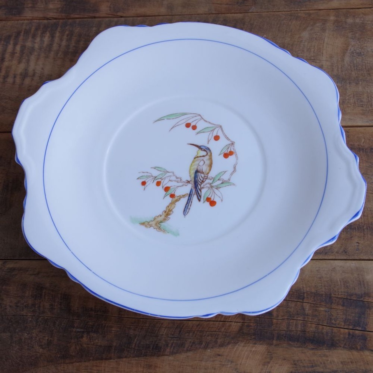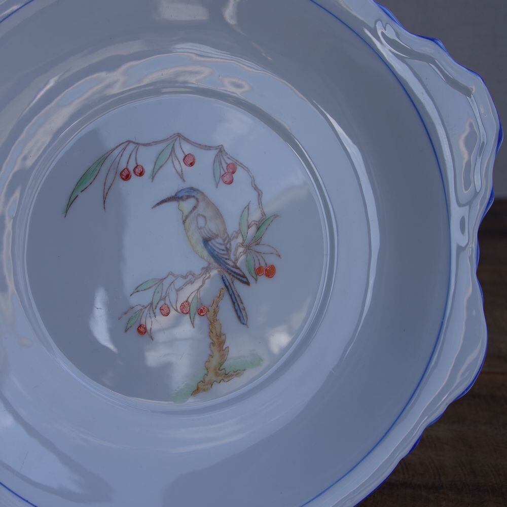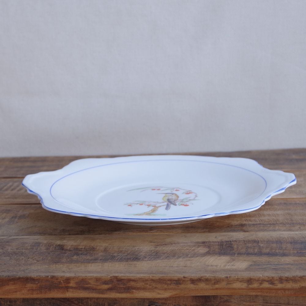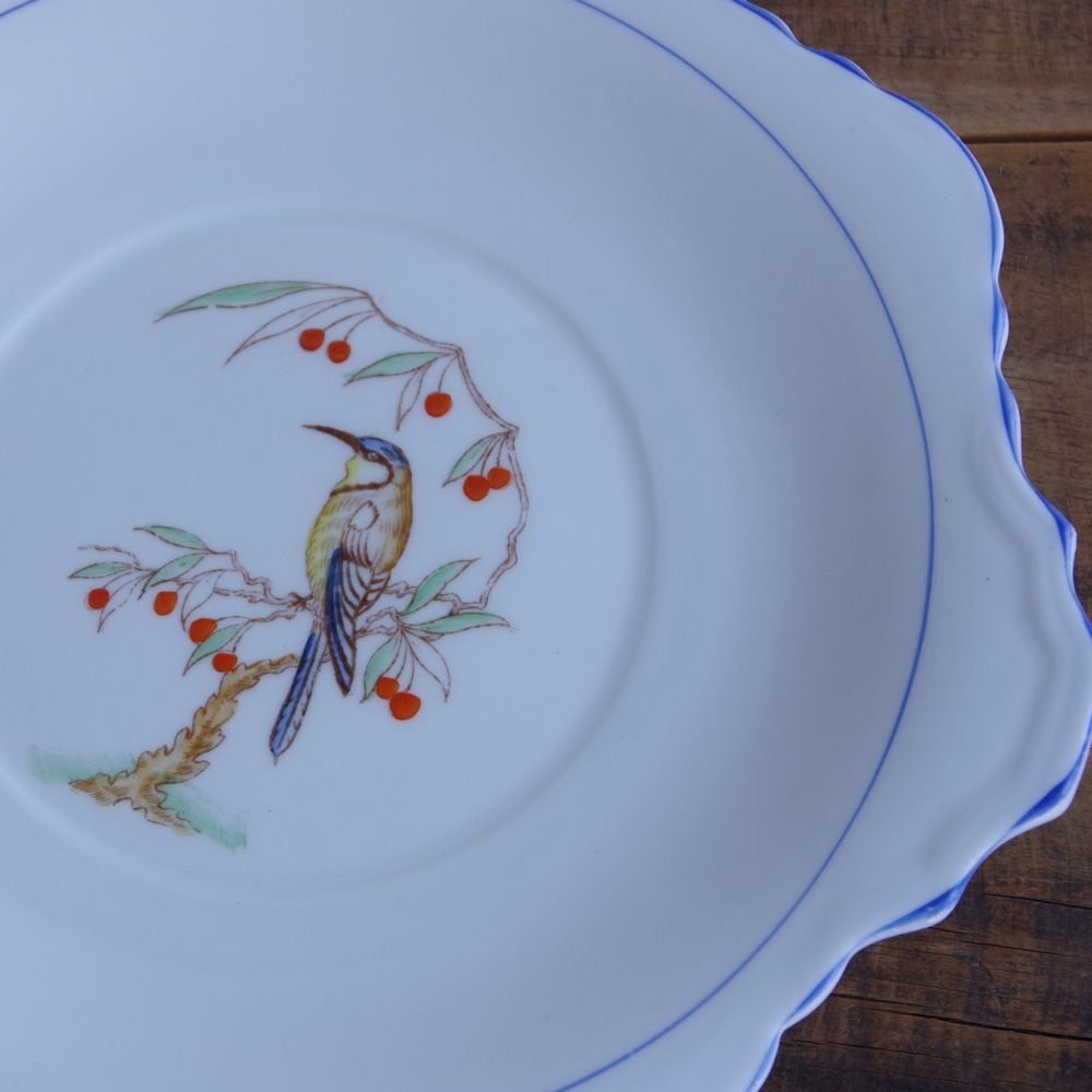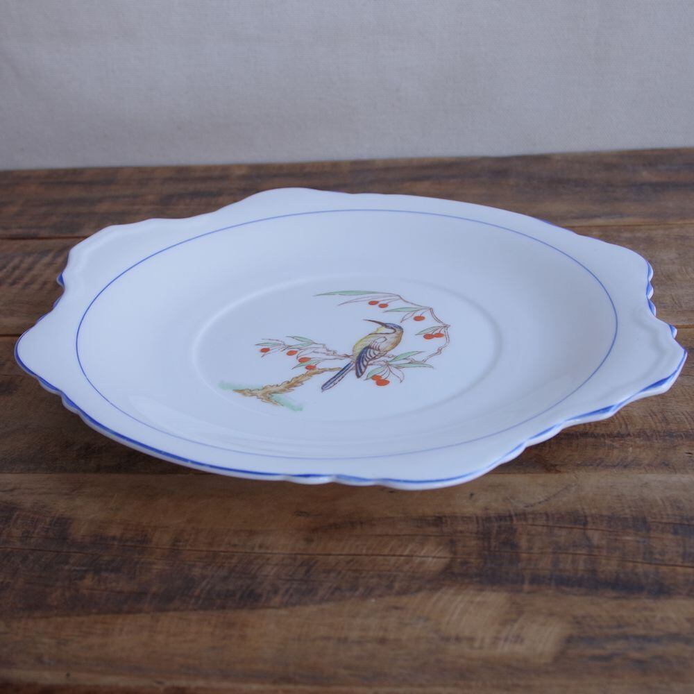 イギリス アンティーク 食器 B&B プレート 持ち手付き 盛り皿 25cm ヒースコート 鳥 カワセミ 赤い実 ブルー Heathcote #231123 陶器 レトロ ヴィンテージ Best Bone Made in England
