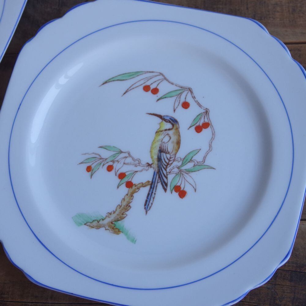 イギリス ヴィンテージ 食器 デザートプレート ケーキ皿 17cm 2枚セット ヒースコート 鳥 カワセミ 赤い実 ブルー Heathcote #231203 陶器 アンティーク レトロ Best Bone Made in England