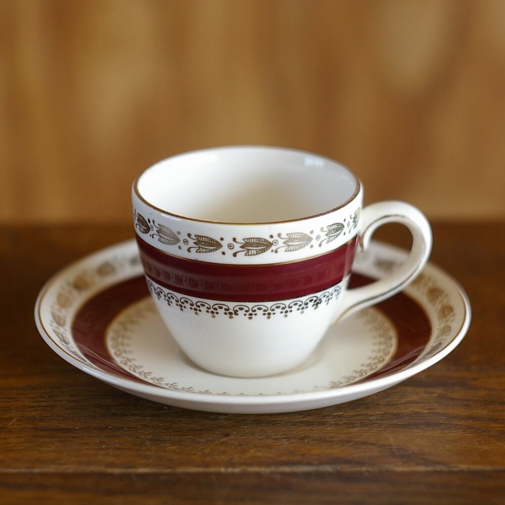 えんじのラインと、ゴールドの花の絵柄がレトロなデザインのカップです。