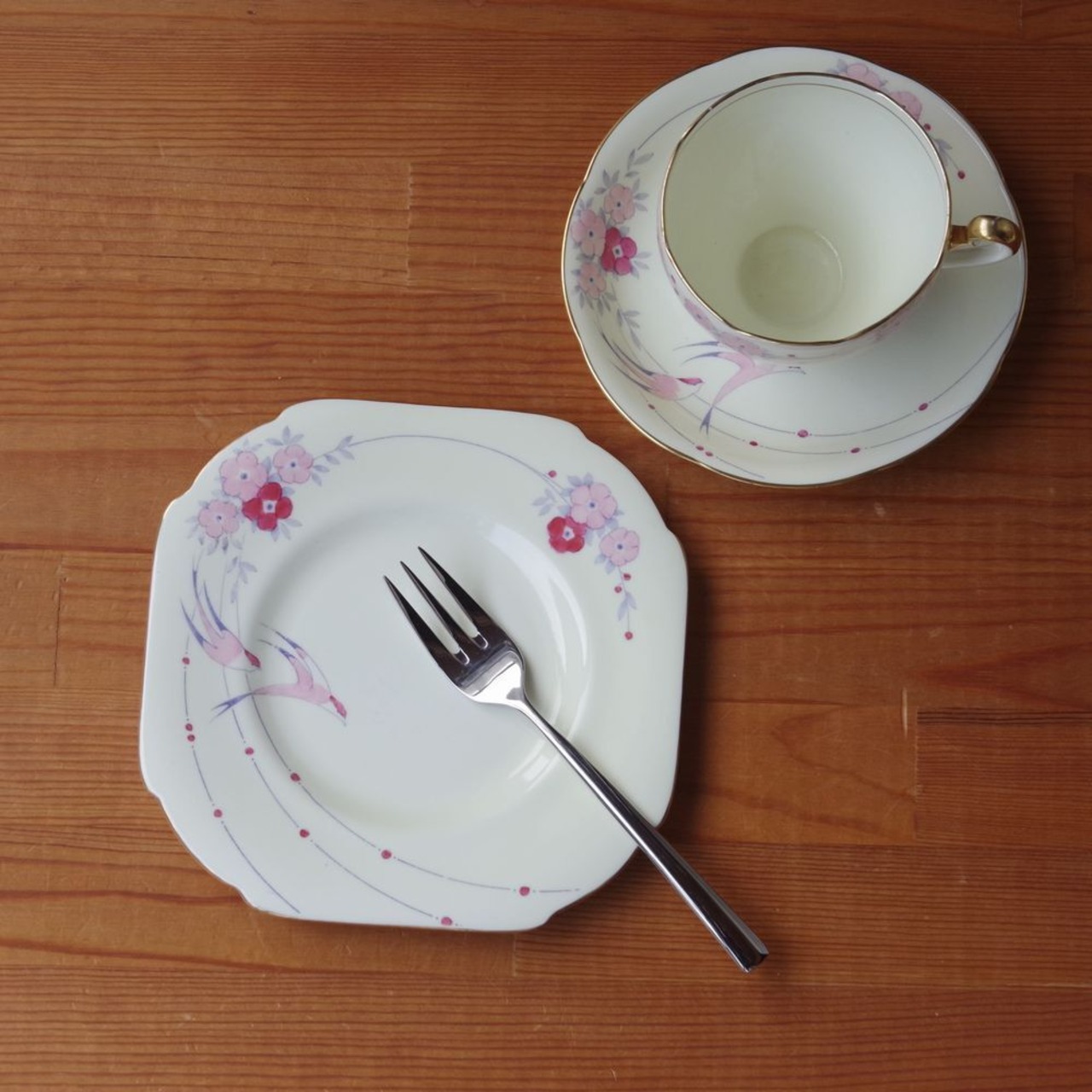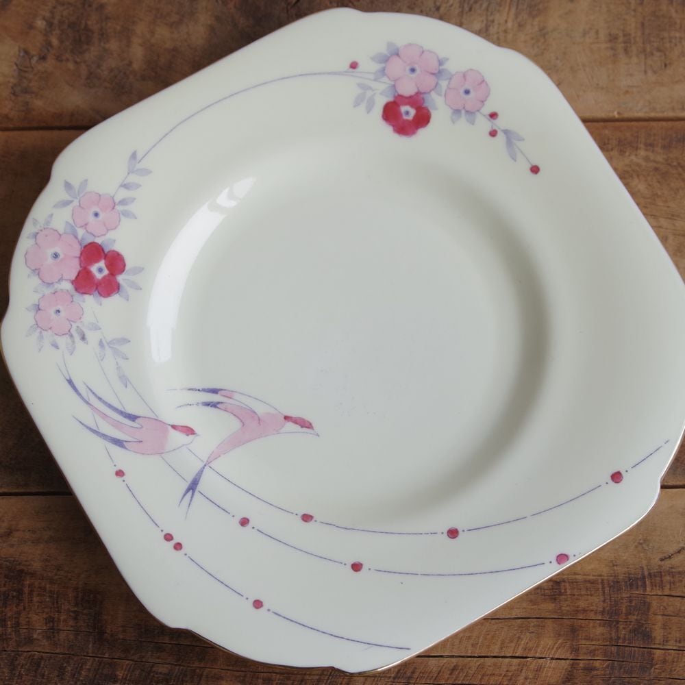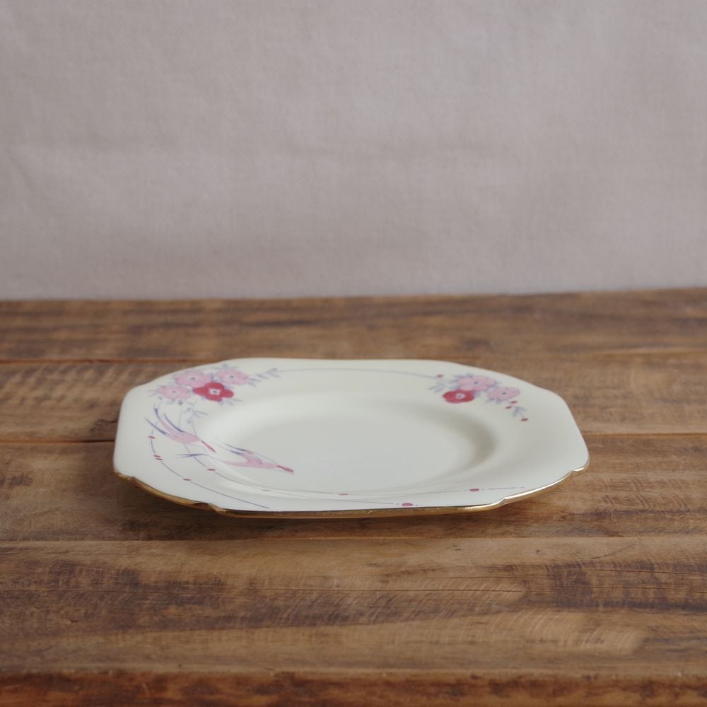 Grafton ピンク 花柄 つばめ 鳥 アンティーク食器 陶器 Westlands ケーキ皿 デザートプレート 16cm 四角 #240224-5 レトロ ヴィンテージ グラフトン ウェストランズ