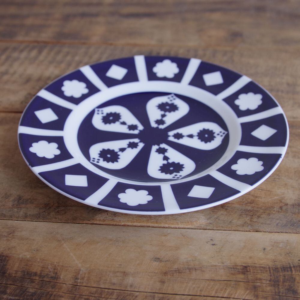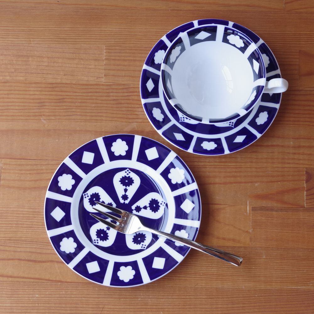コバルトブルーにひし形や花型などの模様が白抜きされています。