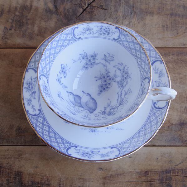 ヴィンテージ食器 タスカン トスカン 鳥 ティーカップ ソーサー うずら 葡萄 ブルー 青 Tuscan #240327-1 イギリス アンティーク レトロ ゴールド ENGLAND