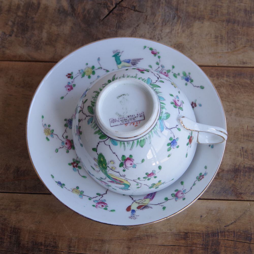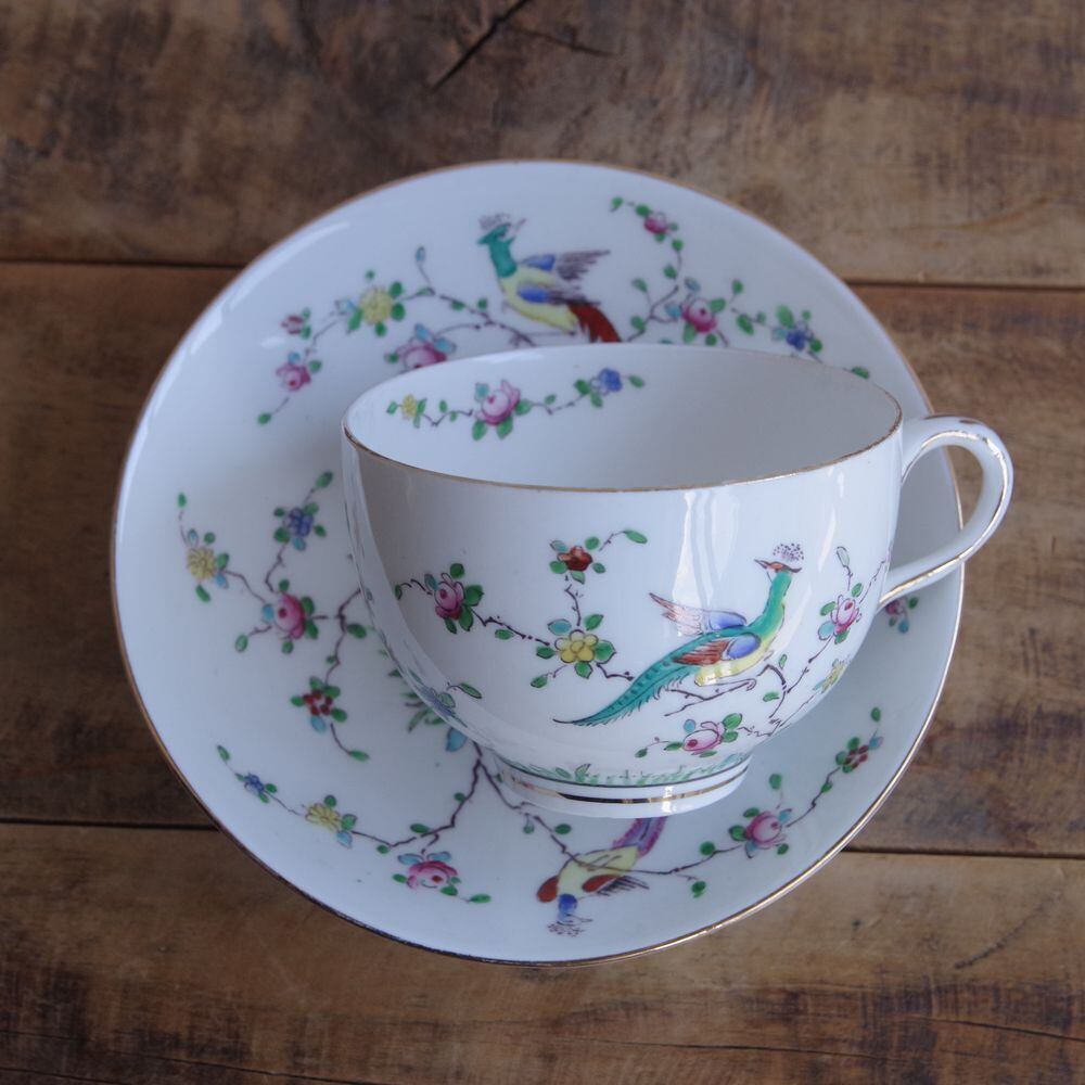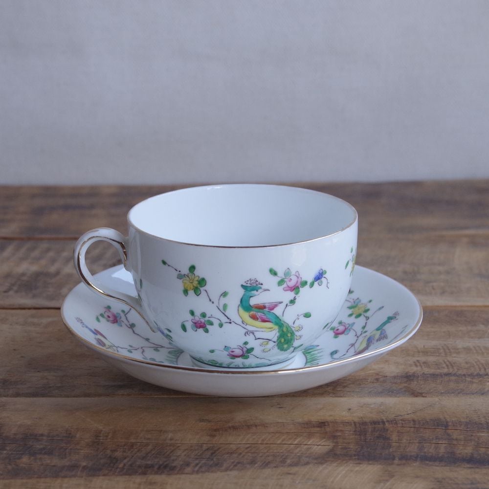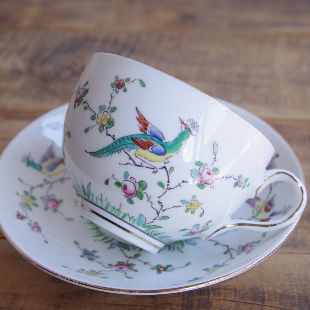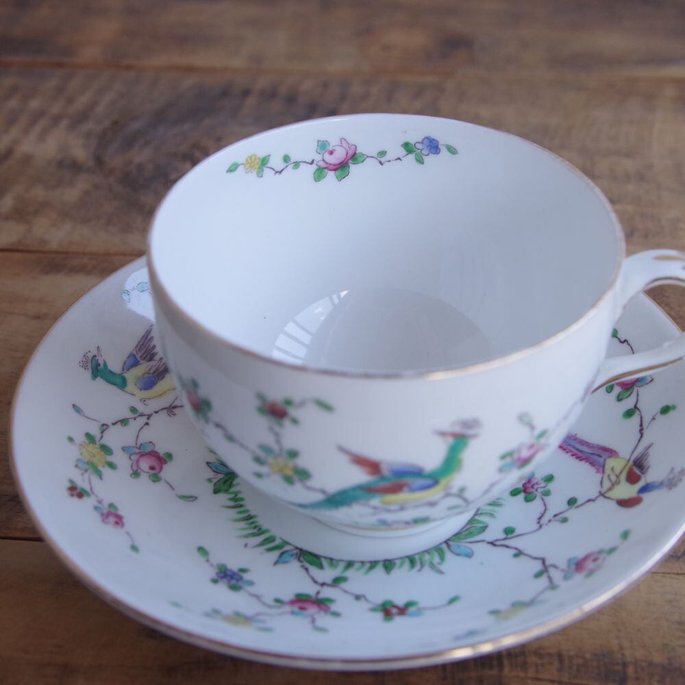 イギリス アンティーク食器 コーヒーカップ ソーサー クラウンスタッフォードシャー 孔雀 鳥 花柄 #240329-3 Crown Staffordshire ヴィンテージ 陶磁器 レトロ 手塗り