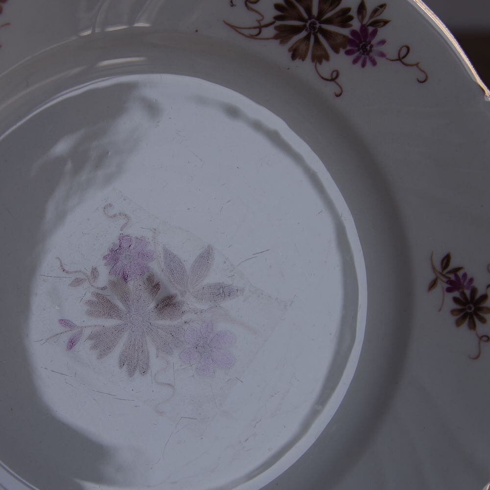 淡い象牙色の陶磁器で、中央やリム部分にブラウンと紫の