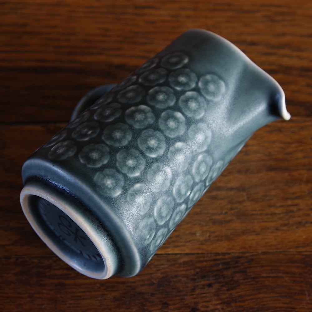 マットなブルーグレイの釉薬と、梅の花のようなレリーフがおしゃれです。