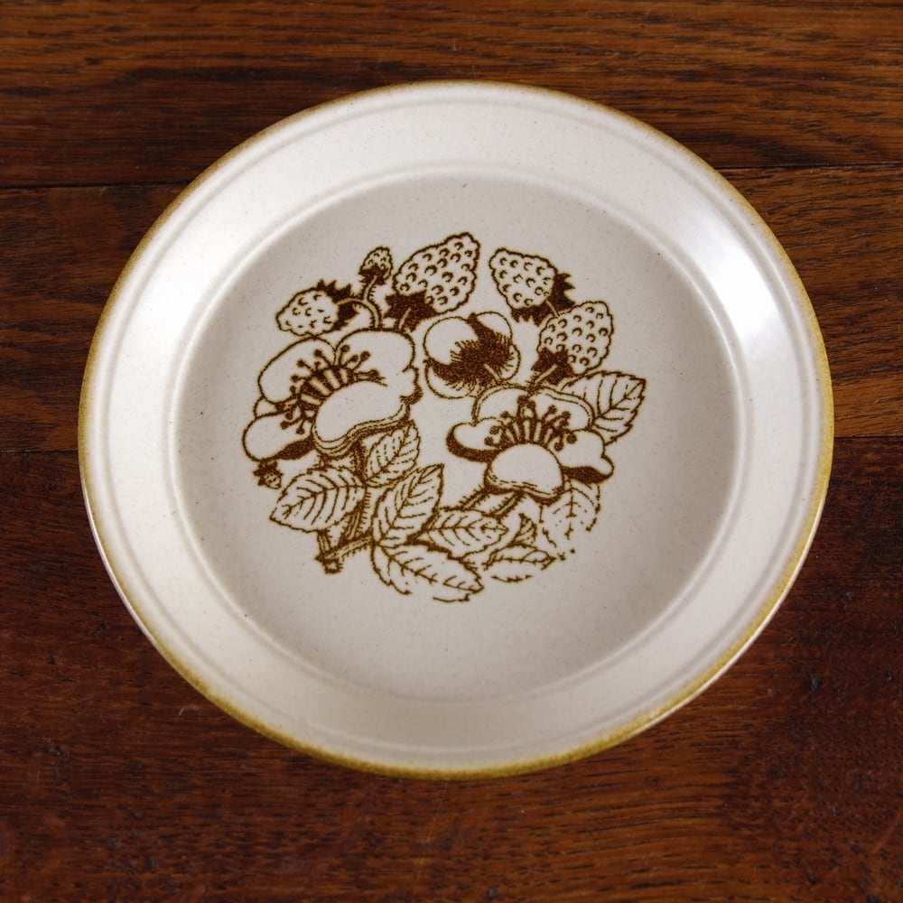 ベージュの地にブラウンでイチゴの実や花の絵柄が焼き付けられています。