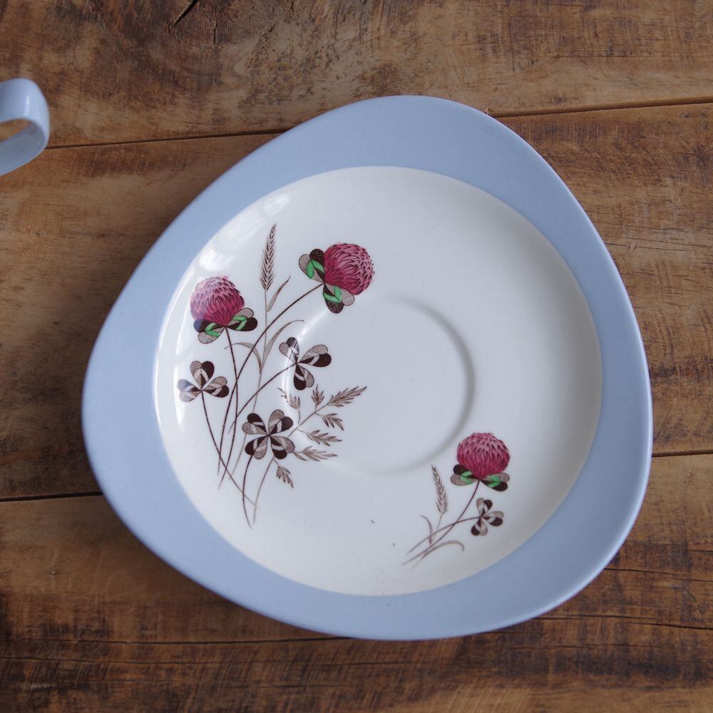 スポード サマーデイズ コーヒーカップ ソーサー 三角形 クローバー シロツメクサ 花柄 ボタニカル柄 水色 Spode Summer Days ヴィンテージ 食器 アンティーク 陶器 レトロ イギリス #240604-4