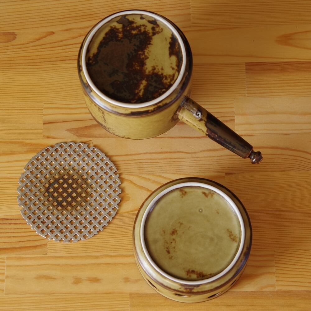 特徴的な形のポットで、ふたはなく、棒のようなまっすぐな持ち手が