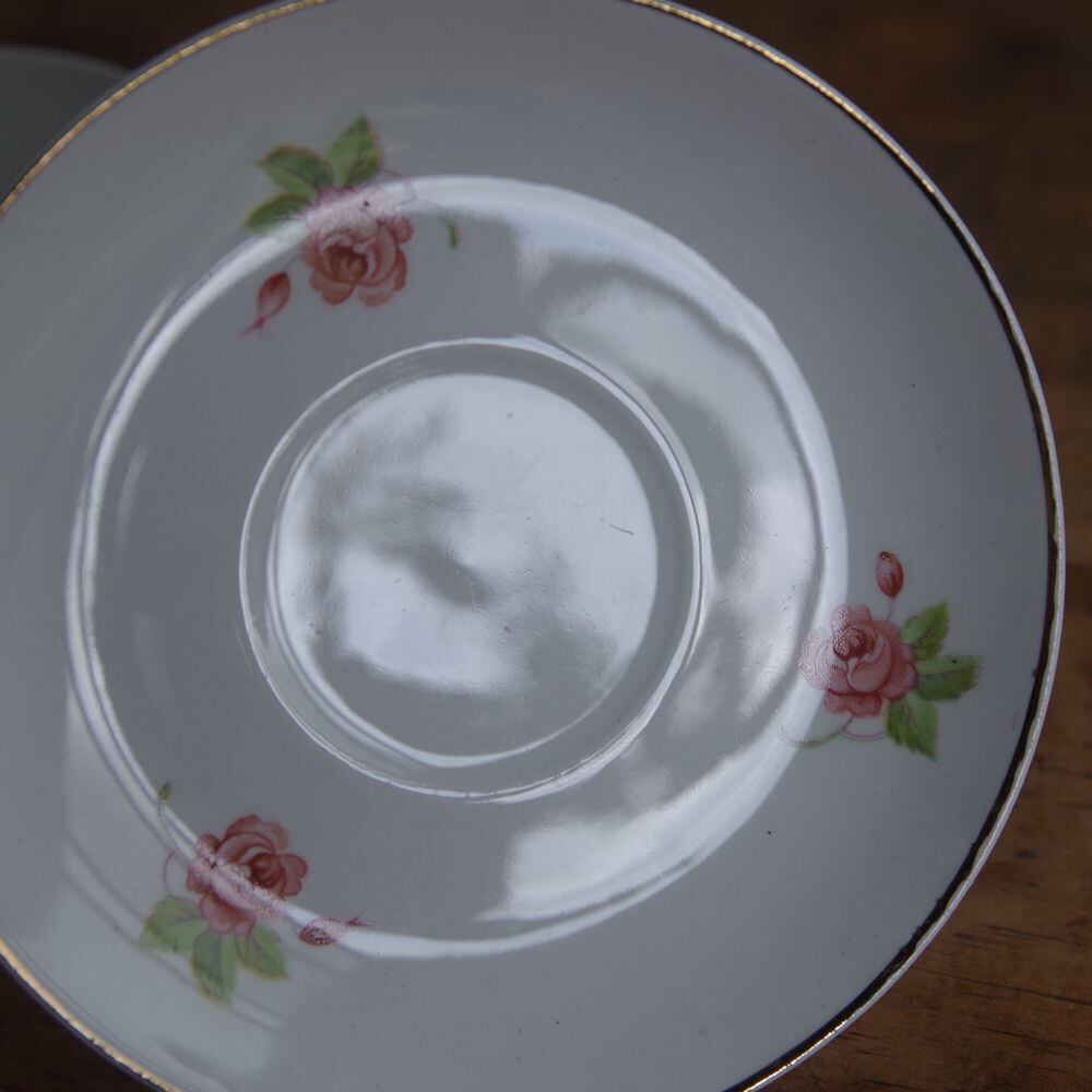 ソーサーにはピンクの薔薇のような絵が入っています。