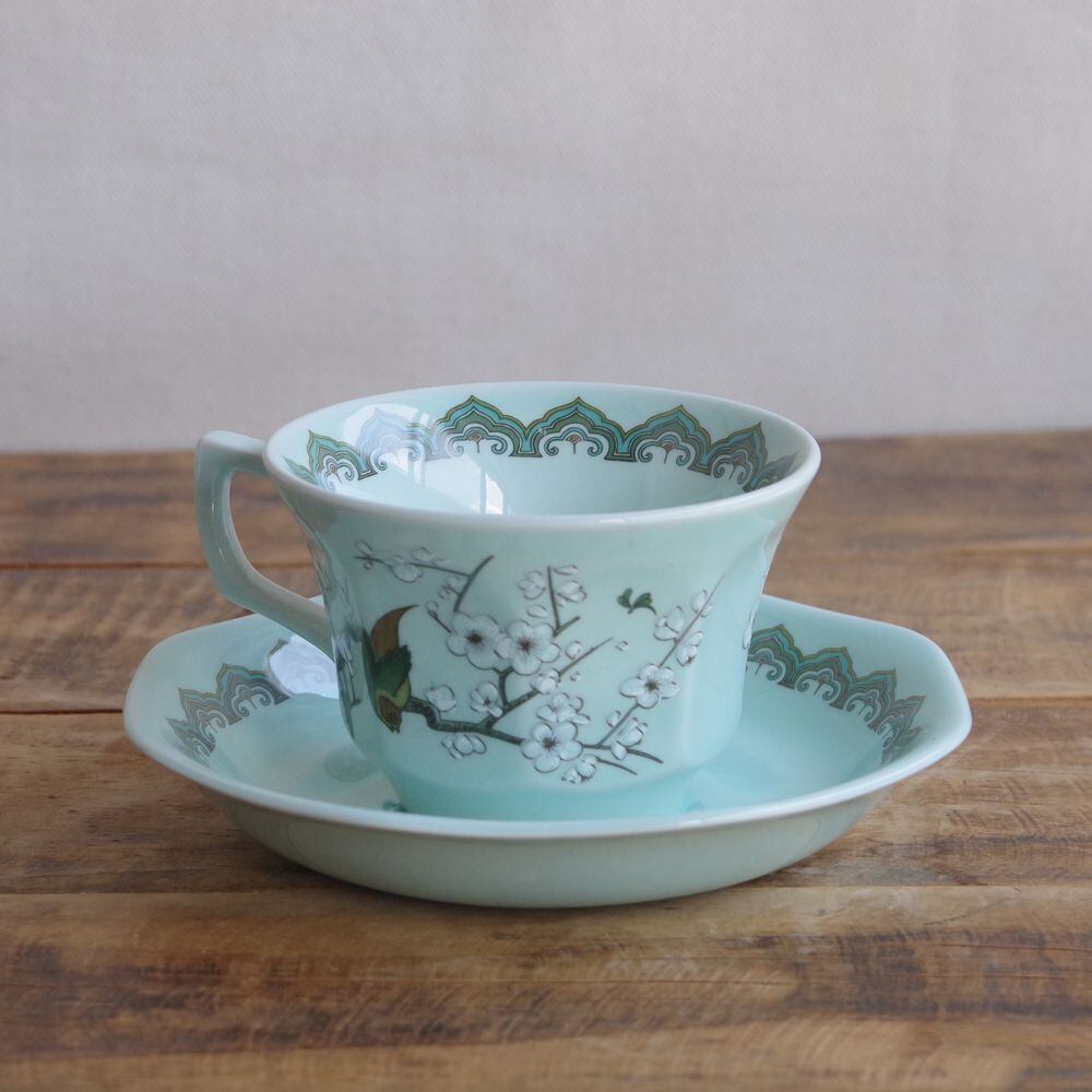 イギリス ヴィンテージ 陶器 食器 アダムス ブルー 梅 鳥 うぐいす ティーカップ ソーサー Adams Calyx ware #240721-3 レトロ オリエンタル