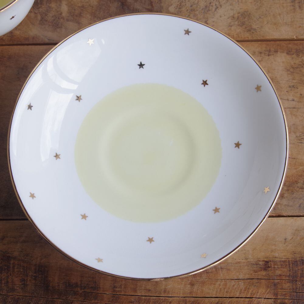 カップの内側の面やソーサーの中央部分は淡い黄色に塗られており、