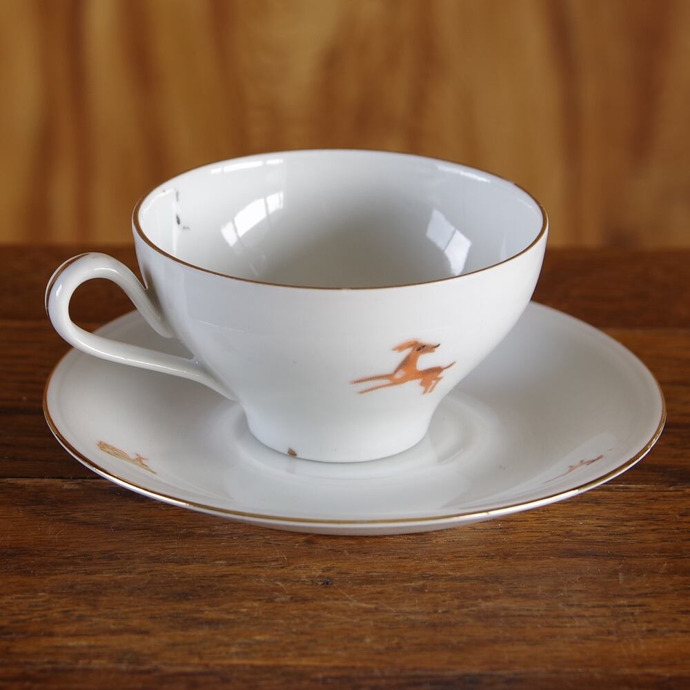 ソーサーには、鹿などの絵柄が入っており、どちらも金色のふちどりがあります。