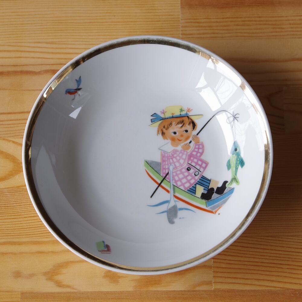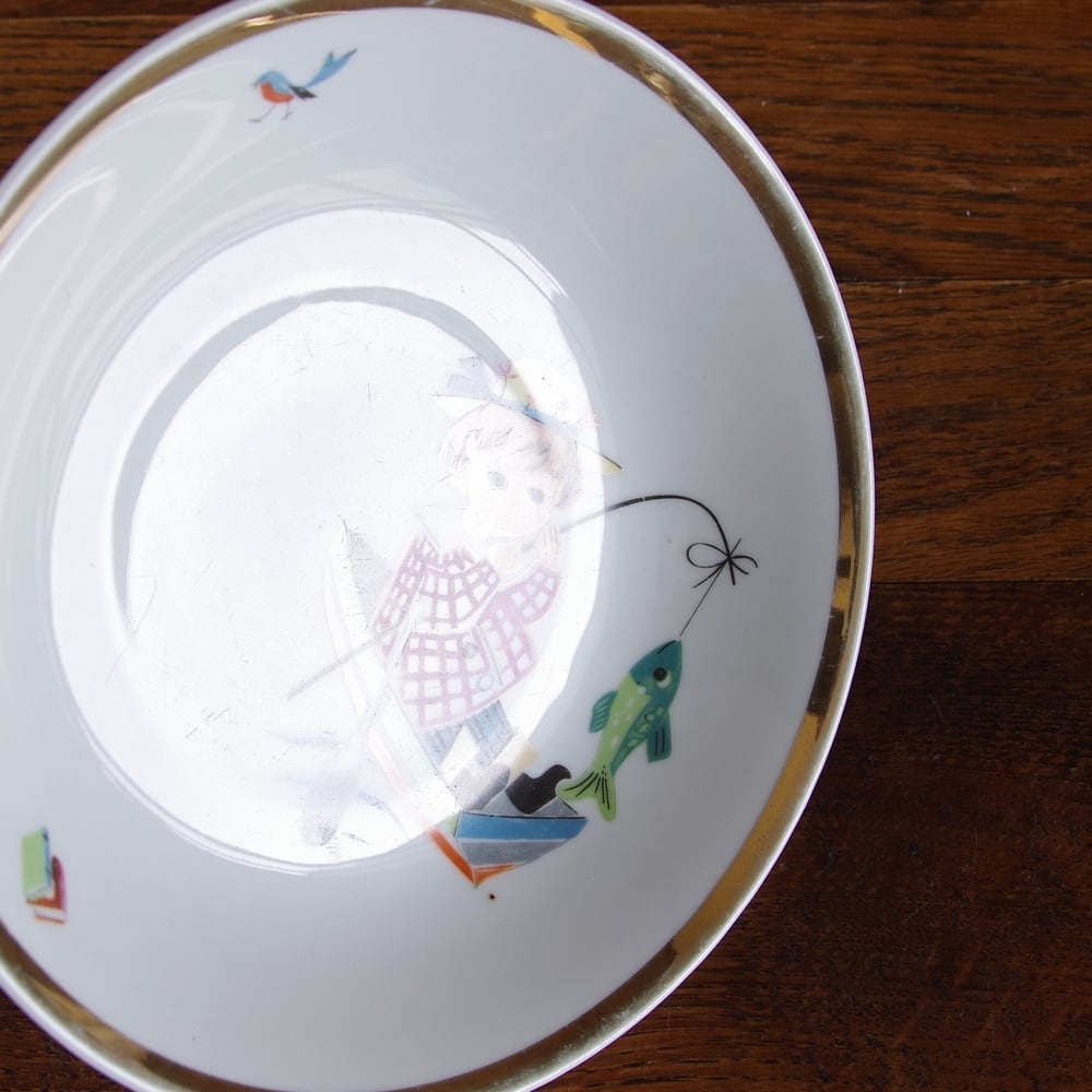 ドイツ製アンティーク食器 Bareuther Bavaria 深皿 菓子皿 ボウル #171122レトロ ヴィンテージ 魚釣り 女の子 小鳥