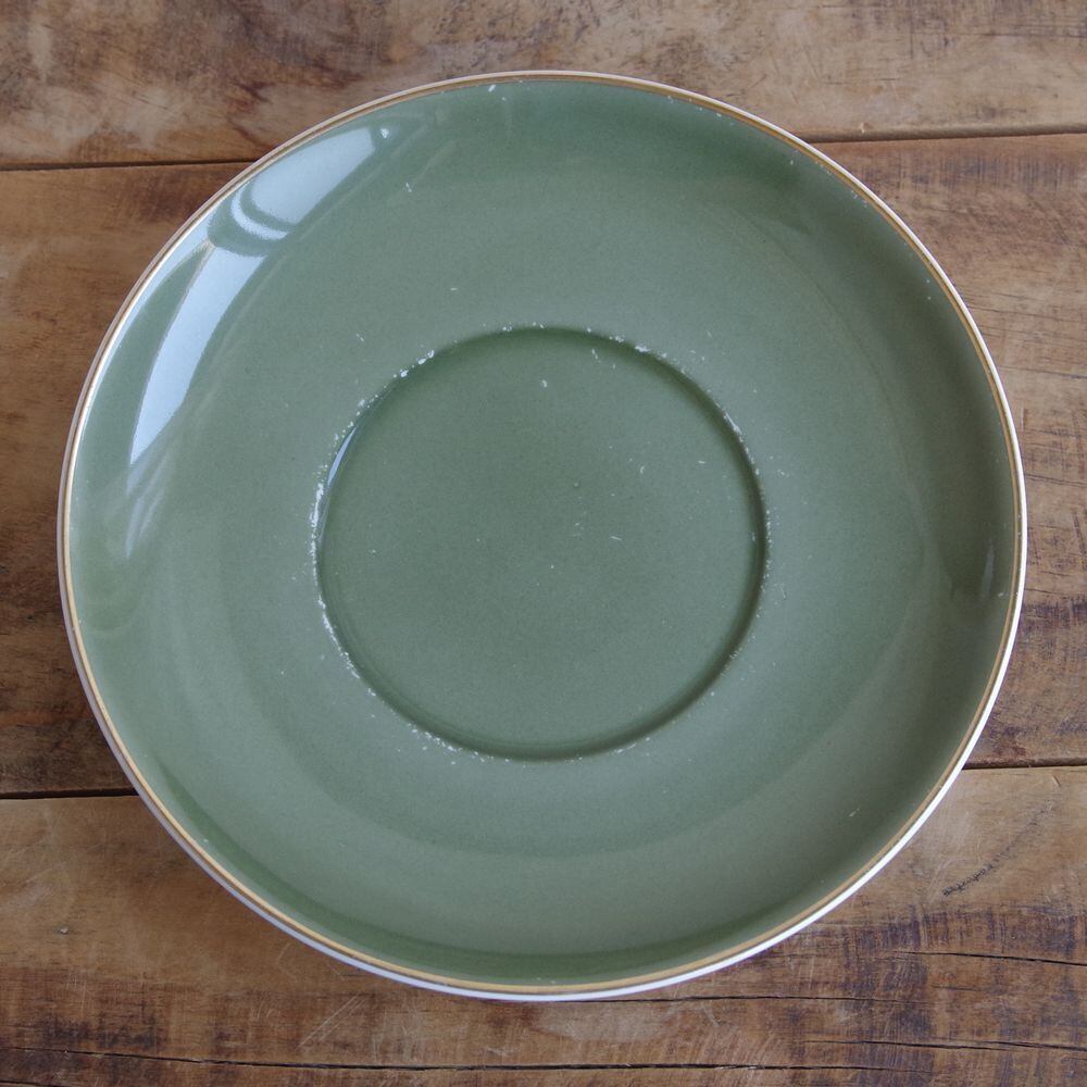 カップの内側やソーサーは、落ち着いたグリーン色に塗られています。