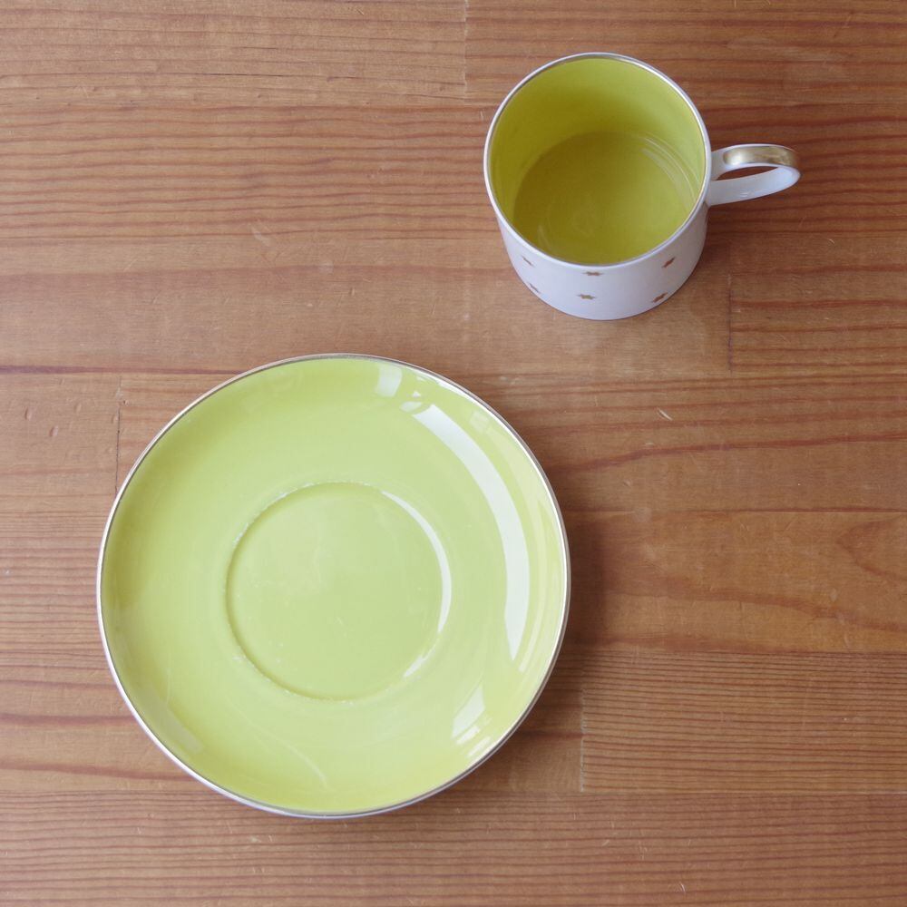 カップの内側やソーサーは、明るい黄色に塗られています。