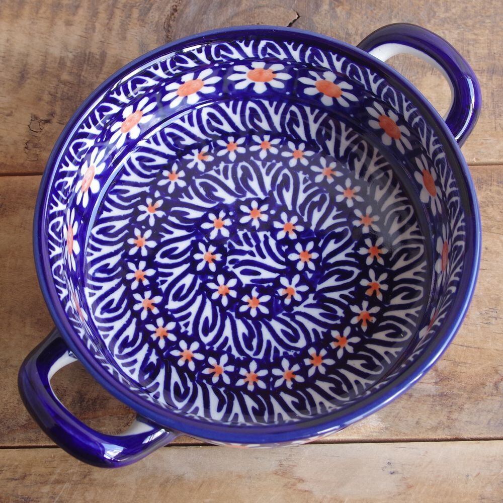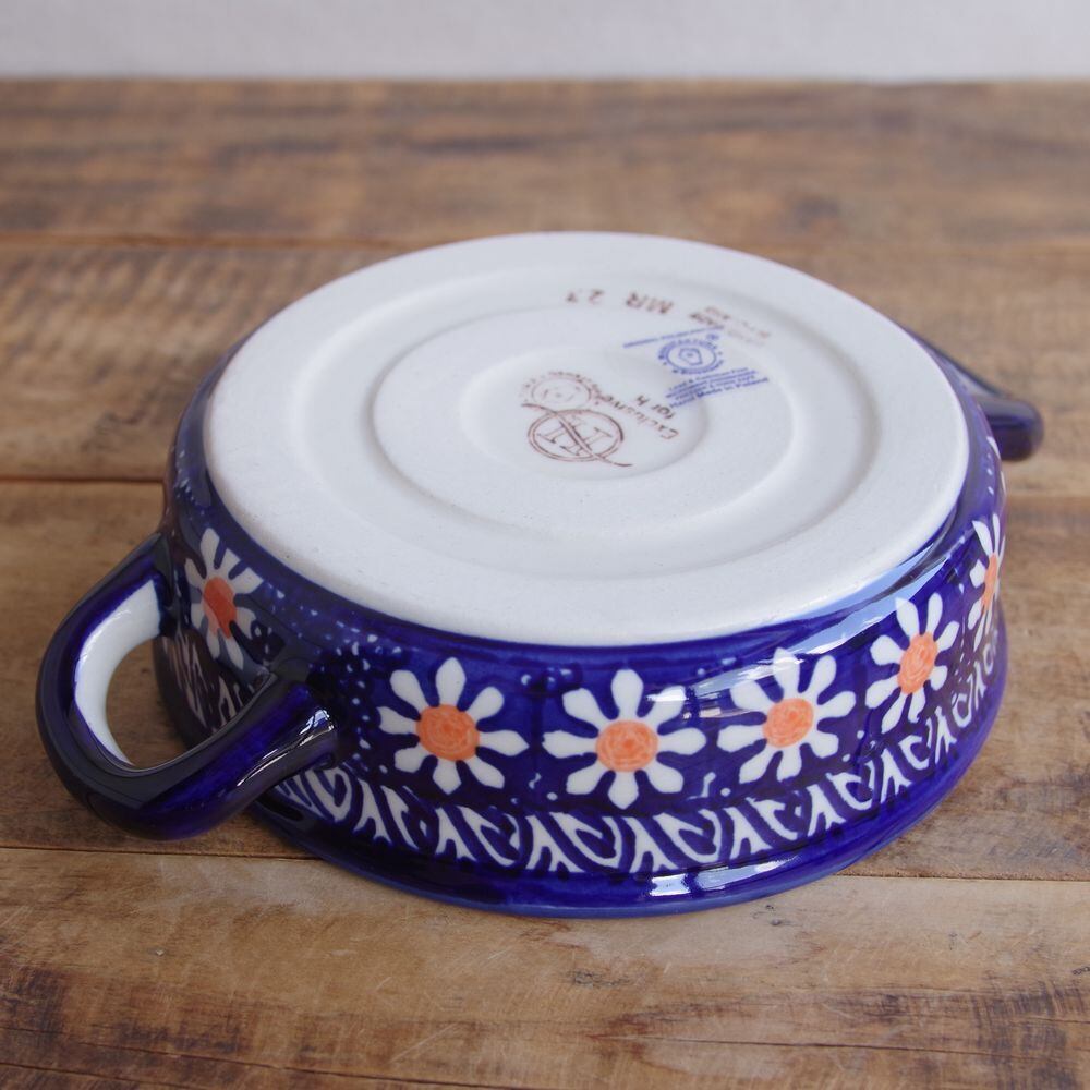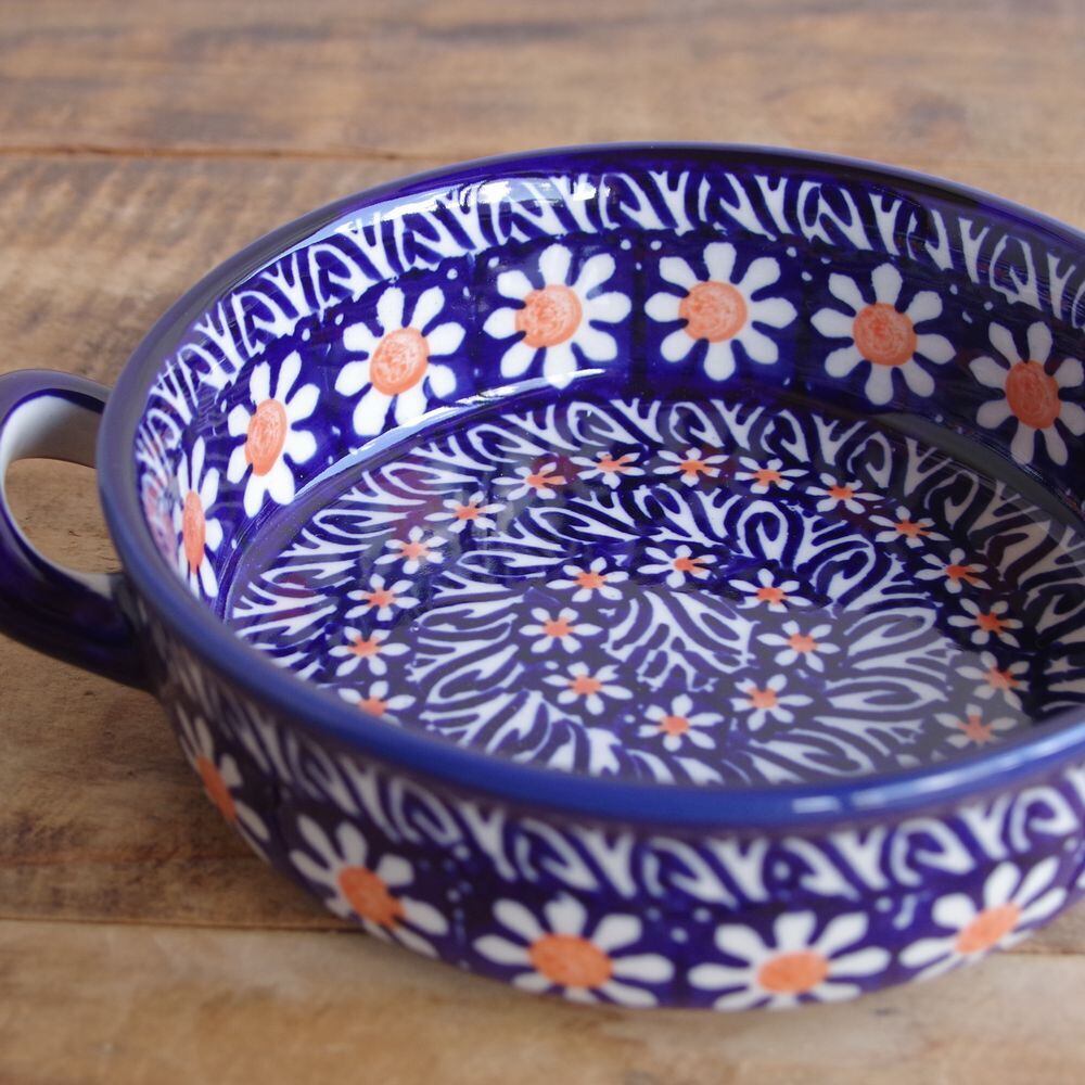 【新品】 ポーリッシュポタリー ポーランド食器 持ち手付き グラタン皿 オーブンディッシュ 19cm マーガレット ネイビー 白 花柄 Z153-ALC5 ボレスワヴィエツ Boleslawiec レトロポップ 陶器 丸い 深皿 ハンドル付き