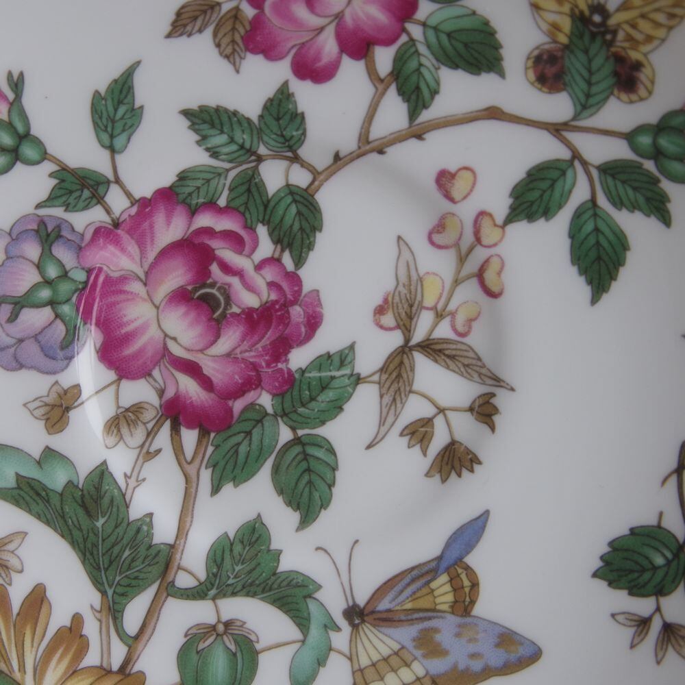 牡丹のような花や蝶の絵柄が入っています。